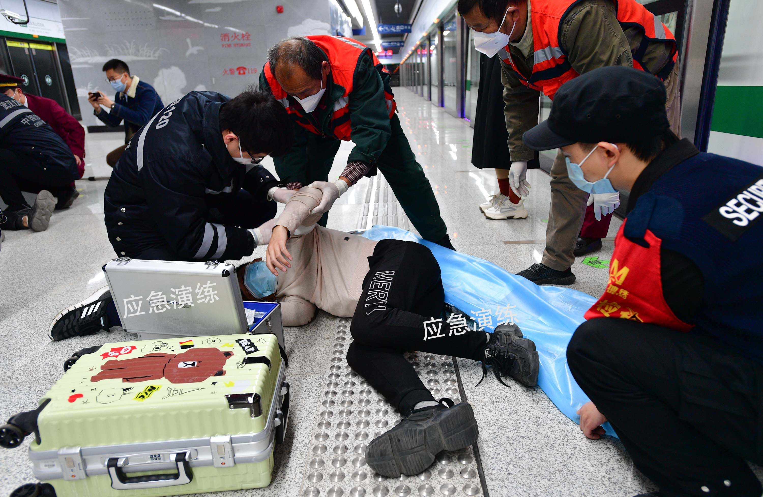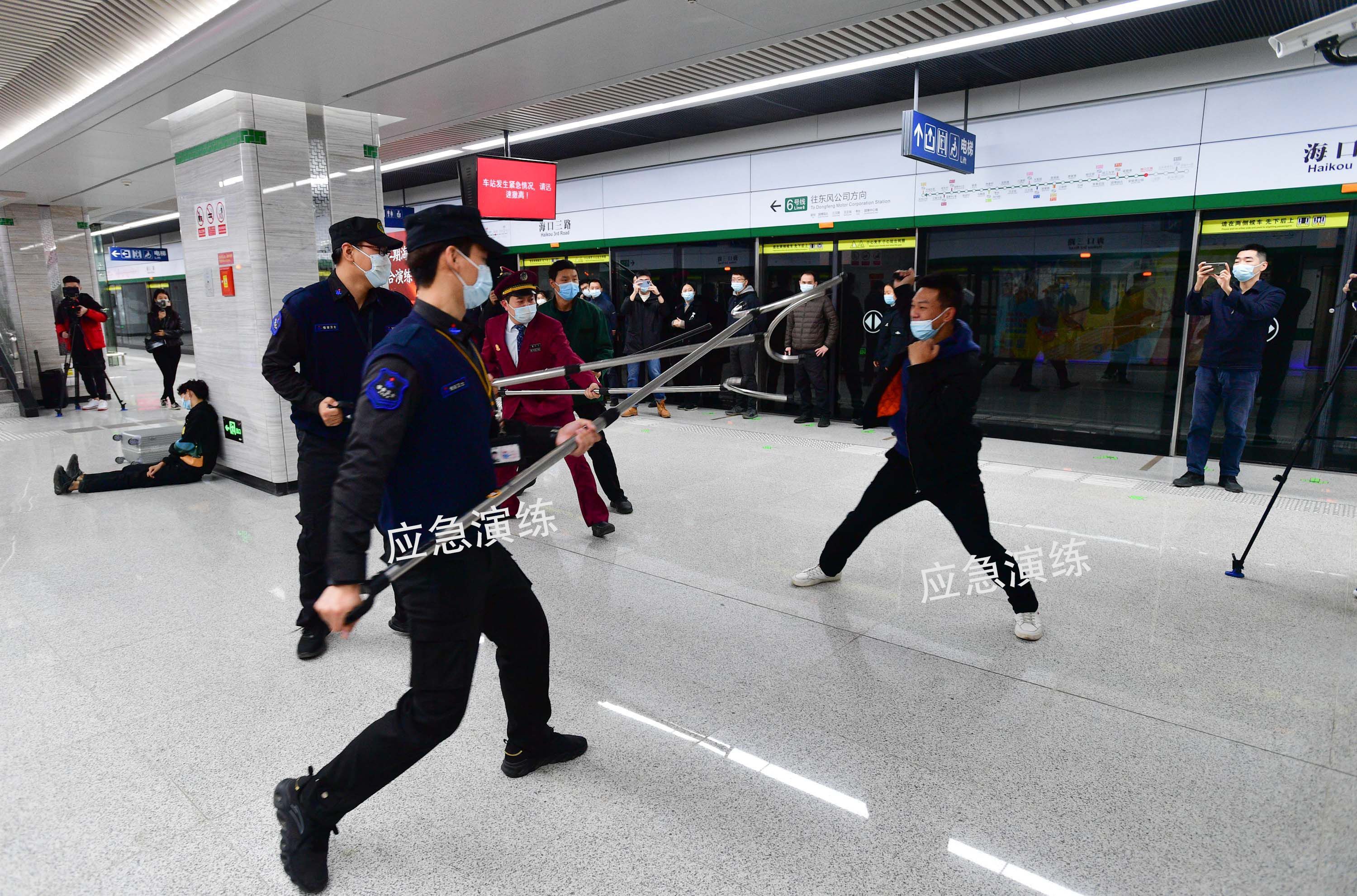 “嘟嘟嘟、嘟嘟嘟……”23日上午10时许, 两名“乘客”携带行李,在海口三路站试图不进行安检强行进站,安检员发现后立即拦截,两人情绪激动,当即推搡殴打安检人员,推搡过程中包内化学物质发生自燃。安检员当即吹响报警口哨,站厅工作人员随即报告车控室启动应急预案,行车值班员速报车站警务室、行车调度员和设备保障人员,值班站长带领车站员工携带相关器材第一时间赶赴现场;驻站民警快速抵达现场同时联动增援警力,联系火警119、急救120快速赶至事发现场。演练现场,地铁车站工作人员、驻站民警组成小作战单元,利用钢叉、齐眉棍、盾牌等装备,以“三叉一棍”“盾叉棍”方式进行对抗,伺机制服扰乱安检秩序乘客;车站工作人员快速疏散周围乘客,并与保洁人员使用手持灭火器进行初期灭火……5分钟后,急救120医护人员赶到现场,对伤员进行简易处理,快速送往医院救治;消防救援队员携带水带、水枪进行灭火;专业抢修队对设备运行状态进行评估。站厅内的安全综合演练刚刚结束,站台另一场实战演练紧急展开——6号线二期工程行驶列车内突发一疑似“精神异常男子”殴打乘客,扰乱车厢秩序,导致2名乘客“受伤”。紧急情况下,乘客中有人利用随身行李与“精神异常男子”搏斗,有人通过紧急通话装置与司机通话,有人手机拨打“110”报警。列车在海口三路站,等待在站台的驻站民警、车站工作人员、保安与“精神异常男子”对峙,并将其快速制服,在外等候的医护人员随即开展受伤乘客救助。通过此次安全综合演练,有效检验了武汉地铁运营过程中处置突发事件现场应急预案的可操作性和时效性,夯实了整体作战能力,加强了公安、消防、卫生等多部门之间联勤联动,紧密配合,为创建平安城市、安全地铁夯实基础。