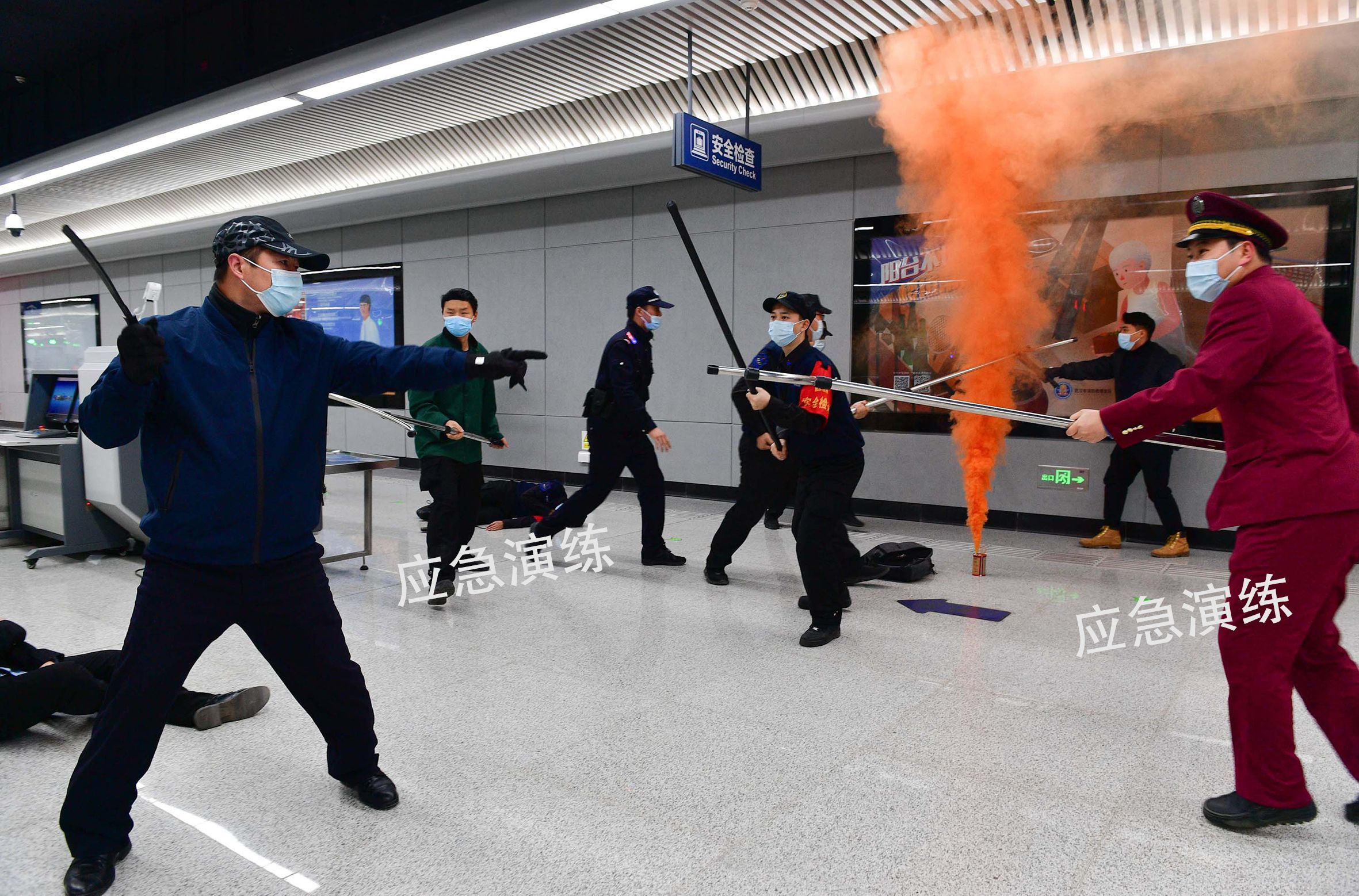 演练现场,地铁车站工作人员、驻站民警组利用钢叉、齐眉棍、盾牌等装备制服“扰乱安检秩序乘客”。记者李永刚 摄