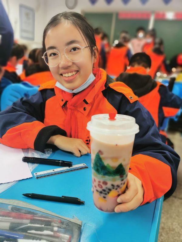 由于是第一次种地,长出的红薯产量不错,但是表皮都裂开了一道道长缝。考虑到学生喜欢喝奶茶,程静动员大家用生红薯“做文章”。首先,把红薯皮刨干净,送到学校食堂蒸熟;然后加入木薯粉揉成芋圆;最后用开水煮熟,配以奶茶粉进行冲泡。不仅如此,学生们还用画笔画出风格各异的奶茶外包装。
