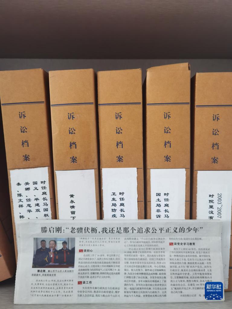 滕启刚办公室书柜里摆放的报纸。新华社记者于力 摄