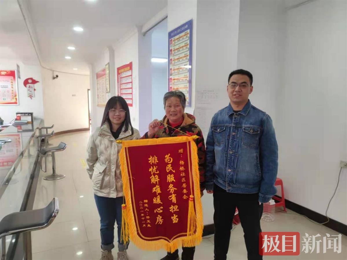 11月22日,周婆婆带着家人,将一面写有“为民服务有担当、排忧解难暖心房”的锦旗,送到了杨桥社区党群服务中心,感谢工作人员为其追回款项。