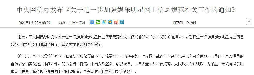 日前,中央网信办印发通知,对娱乐明星在网上的各类信息进行规范,通知一共分为四个方面15条。通知要求设立负面清单,涉低俗炒作明星绯闻丑闻、诱导粉丝过度消费的内容,直接上负面清单。对明星的各类账号,包括经纪公司、后援会的账号,要加强监控、动态管理。对违法失德明星艺人采取联合惩戒措施,全网统一标准,严防转移阵地“曲线复出”。