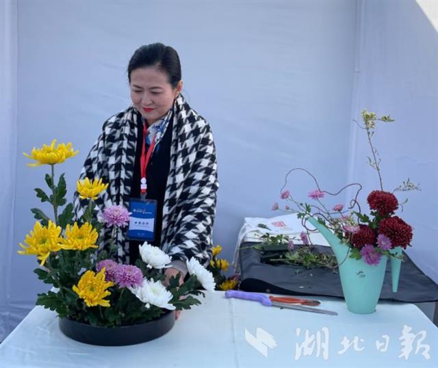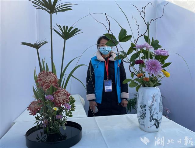 菊花花艺参赛选手、武汉花穗小原流学会会长由美创作的“小原流菊三种”极其简洁,却引来众多关注。她说,花艺原本就应该融入人们的日常生活,花道越简洁越易学易做。