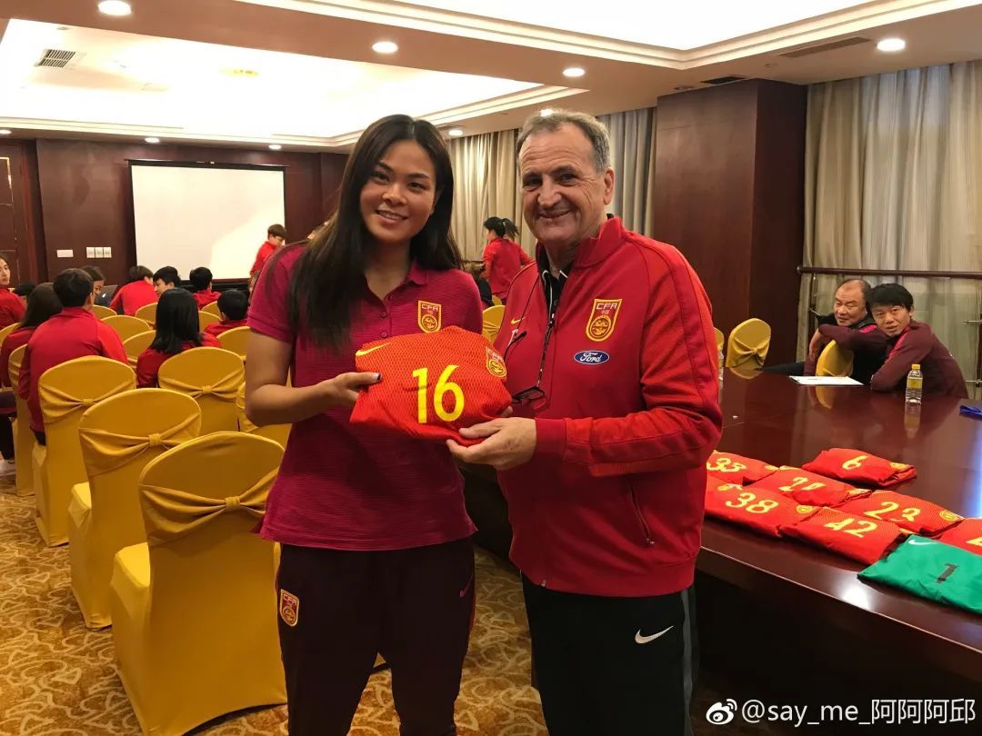 邱芳芳和前中国女足主帅布鲁诺。 图片来源:邱芳芳微博