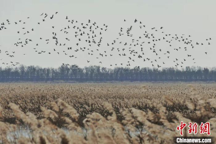 初冬至,又到候鸟迁徙期。寒风吹起北大港湿地的芦苇荡,候鸟或盘旋在天空,或歇息于水面,“叽叽喳喳”叫着,好一副热闹景象。