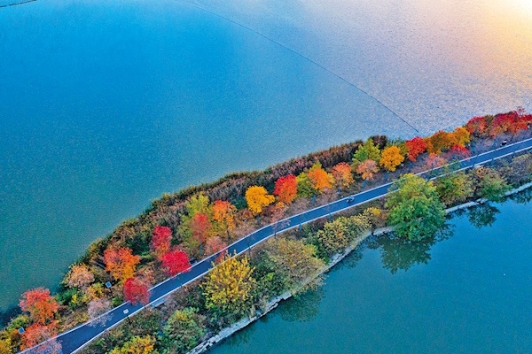 11月23日,傍晚的阳光洒在金银湖绿道上,树叶五彩斑斓,美不胜收。连日来,武汉天气晴朗,空气质量优良,武汉市东西湖区金银湖总长42公里的滨湖湿地绿道,吸引了不少市民前来散步游玩。