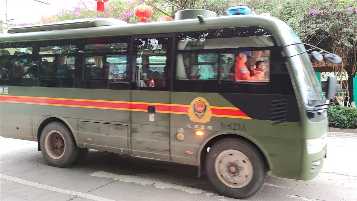 消防队员陆续乘车返回驻地 视频截图