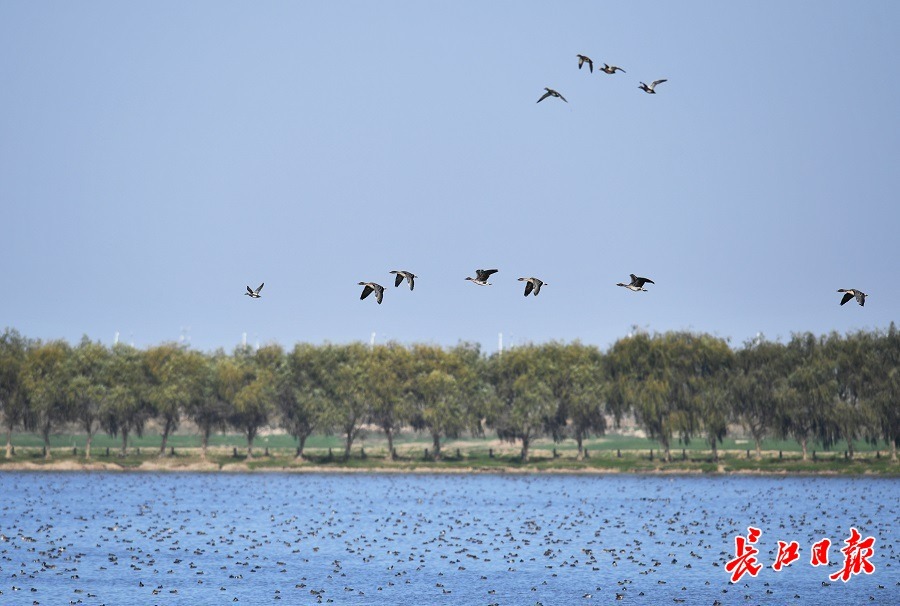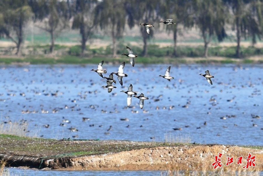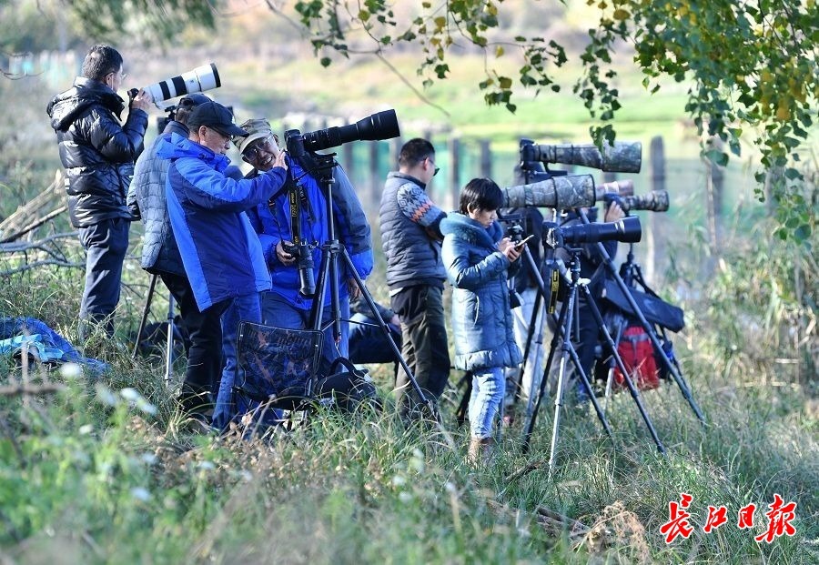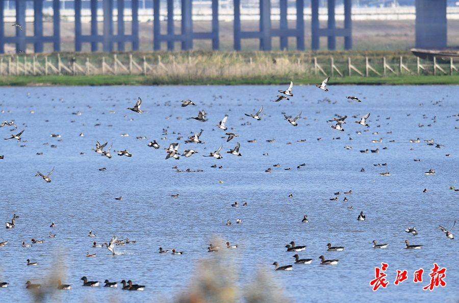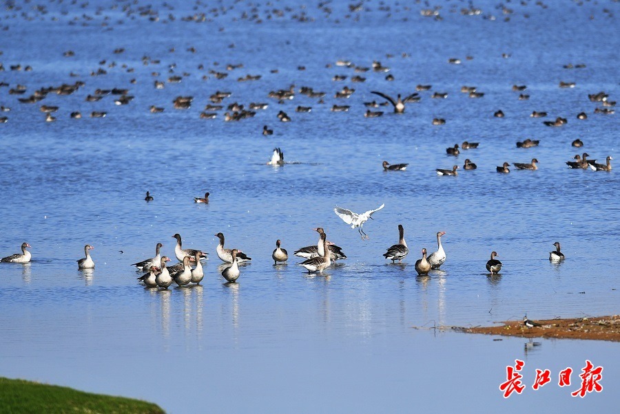 长江日报大武汉客户端11月25日讯 11月24日,在东西湖区柏泉街府河湿地保护区,距离岸边约300米开外的河滩和水中,包括不同品种的大雁、野鸭以及鸬鹚、凤头草鸡、苍鹭等数不清的冬候鸟聚集在一起,享受温暖的阳光。有的区域,整个水面上密密麻麻的都是水鸟,场面蔚为壮观。(长江日报记者喻志勇 摄影报道)
