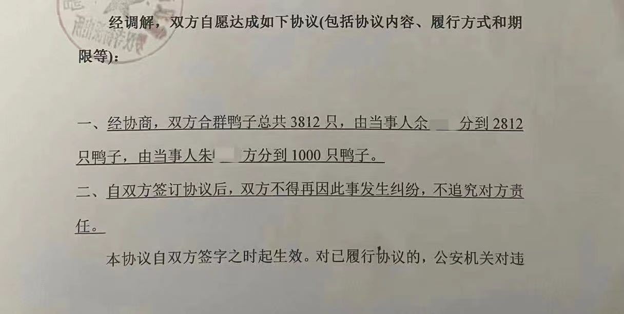 在民警的努力下,朱先生和余先生终于达成了调解协议,朱先生分得1000只鸭子,余先生分得2812只鸭子。