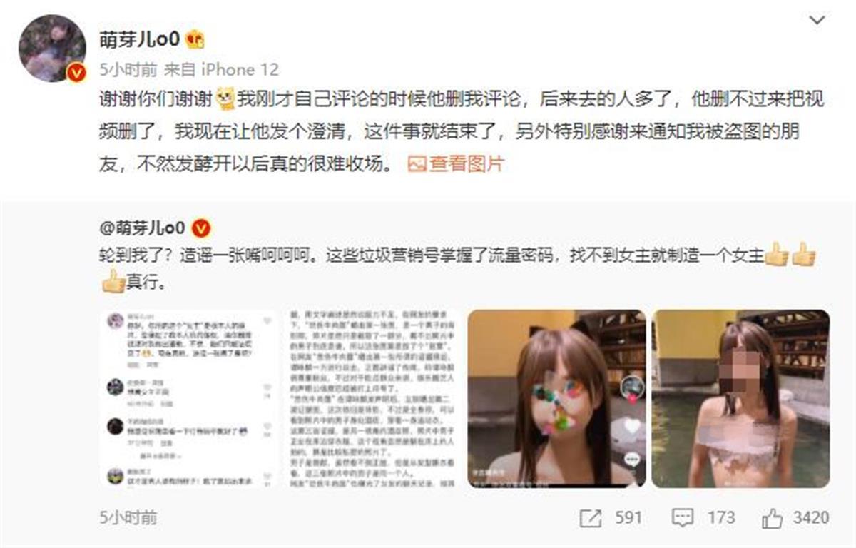 博文中配发的截图显示,萌芽儿评论称,“你用的这个‘女主’是我本人的照片,您侵犯了我本人的肖像权,请你删除视频对我做出道歉,不然,咱们只能法院见了,现在真的,造谣一张嘴了是吧。”