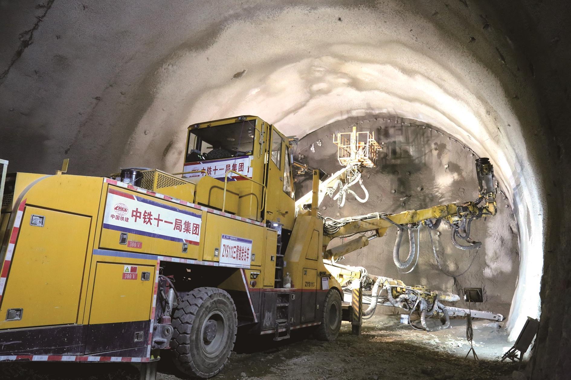 在隧道掘进过程中,与机器人紧密配合的,还有中铁十一局的隧道掘进“利器”——全电脑三臂凿岩智能台车。