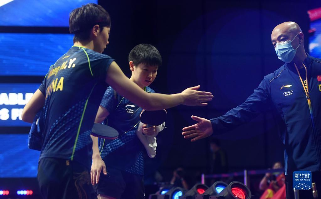 11月25日,王曼昱(左)/孙颖莎(中)赛后接受教练肖战的祝贺。