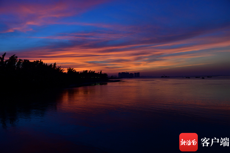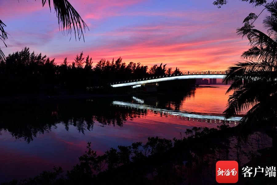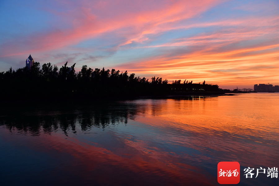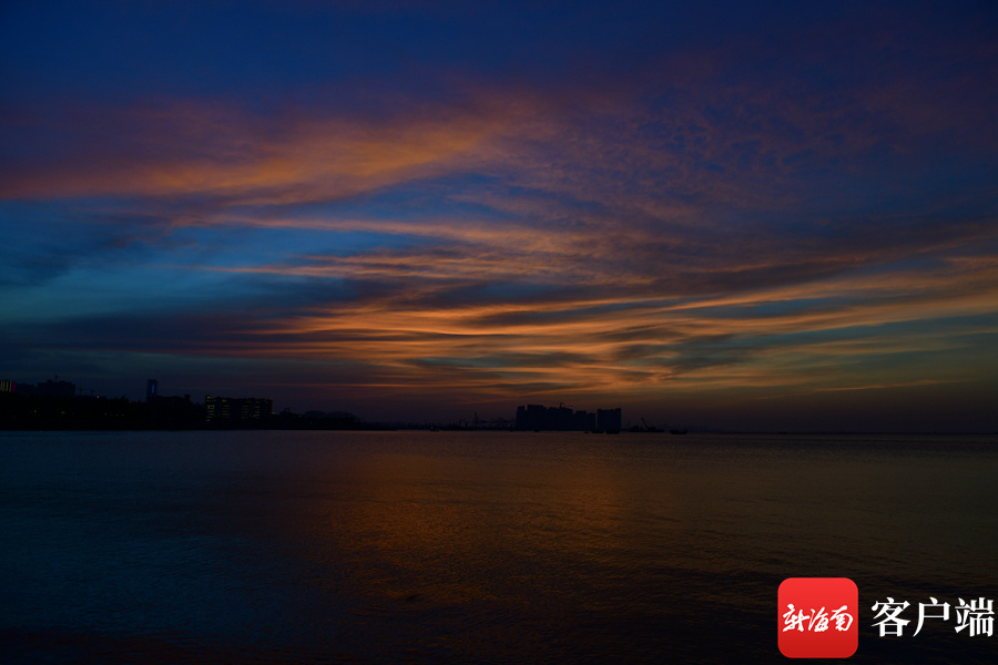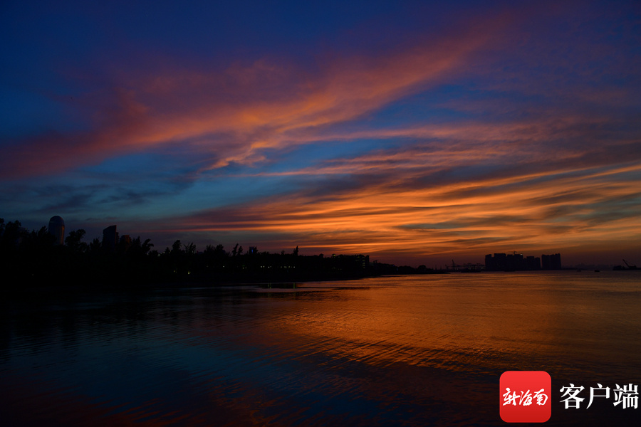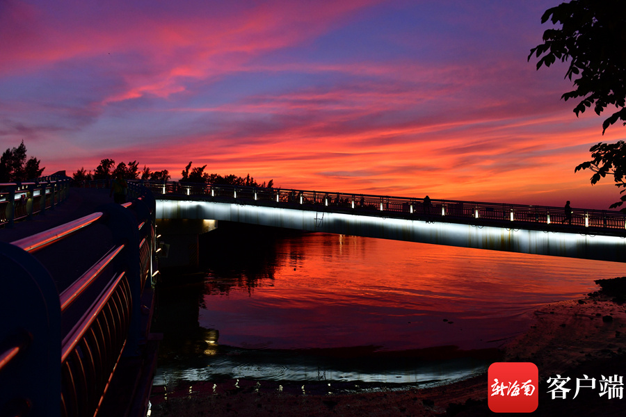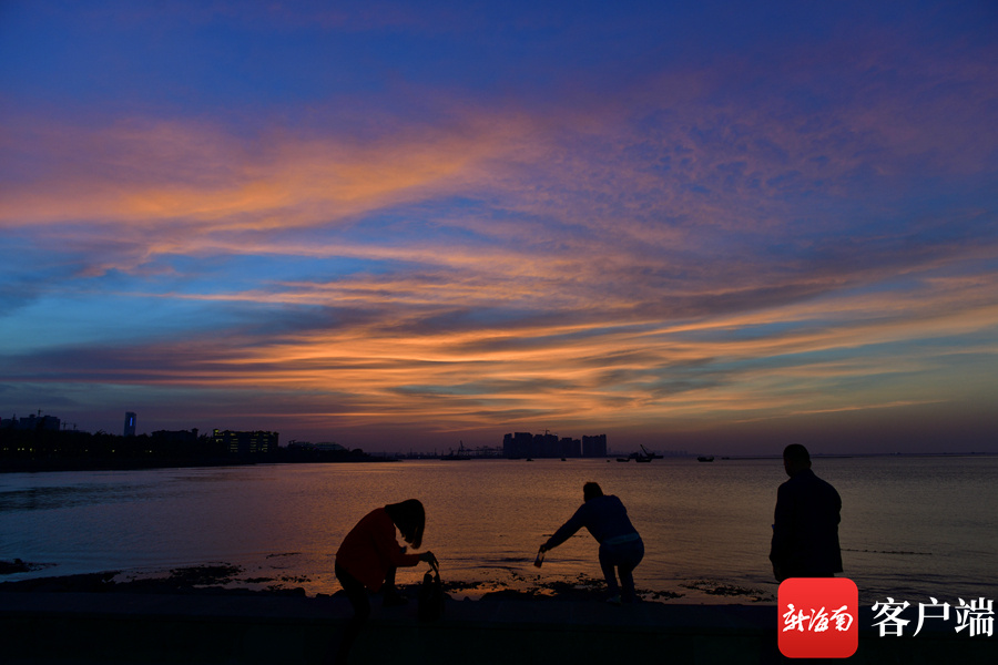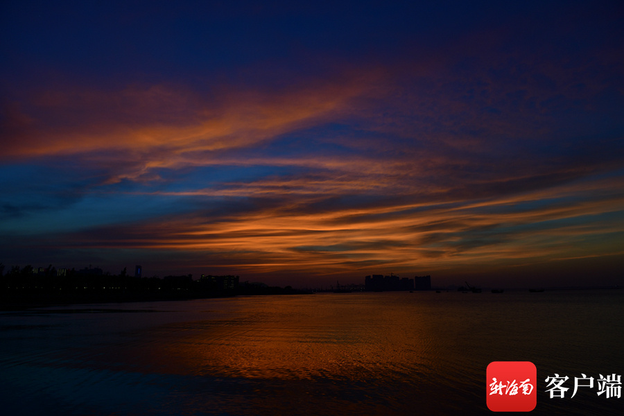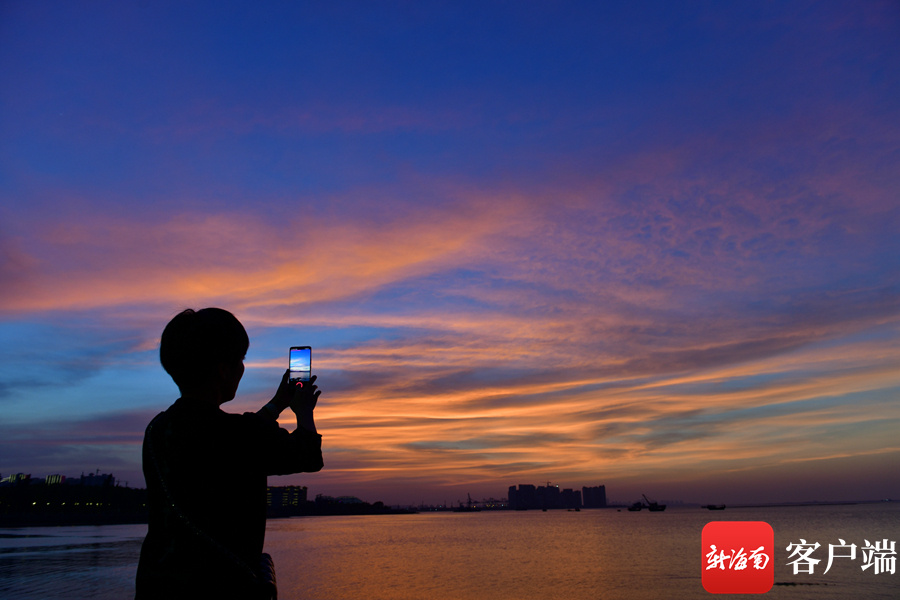 新海南客户端、南海网、南国都市报11月26日消息 (记者 陈卫东)11月26日傍晚,海口天空出现火烧云,绚丽的色彩,倒映在海面,美不胜收。海口湾市民、游客纷纷驻足欣赏这美丽景色。
