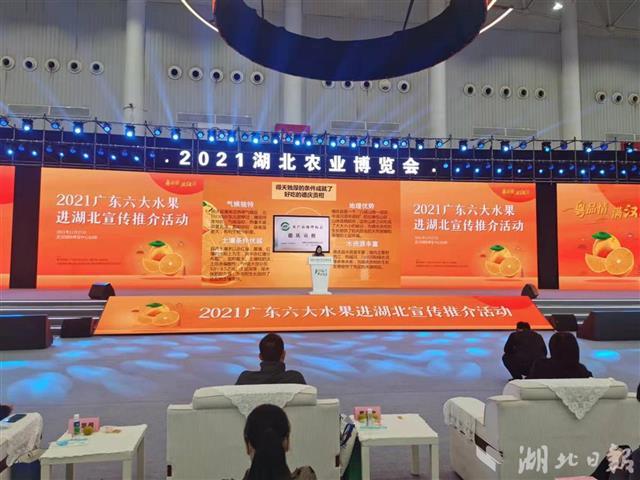 湖北日报讯(记者祝华、通讯员张静)“德庆贡柑已成熟,枝头胖嘟嘟,甜蜜挂满了果树……”11月27日,广东德庆贡柑的专属歌曲《小甜柑》唱响2021湖北农博会会场。当天,广东六大水果湖北推介会开幕,德庆贡柑、广东荔枝为消费者带来秋冬的甘甜。