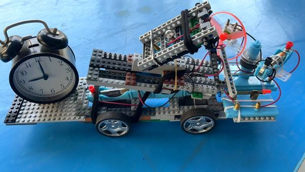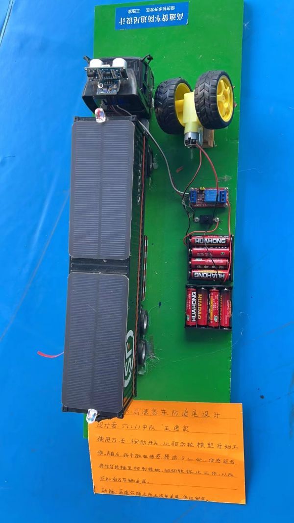 六(1)班的王逸宸设计了一款防追尾的高速货车,按下开关后,货车开始在“高速公路”上飞驰。眼见货车将要撞上前方的车辆,王逸宸马上把手放在传感器前5厘米处,货车的车轮立刻停止工作。不少围观的学生啧啧称奇:“太神奇了!这种货车设计得很巧妙。”五(1)班的徐梓航发明的多功能台灯,不仅有照明的功能,而且“扮演”着风扇、闹钟的角色,满足学生们的“一站式”需求。长江日报记者观察到,多功能台灯的外形如同一辆“导弹发射车”,车上布满了大大小小的零件,各种路线盘根错节,移动起来非常方便。