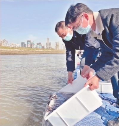 11月23日,武汉渔政码头胭脂鱼放流现场。