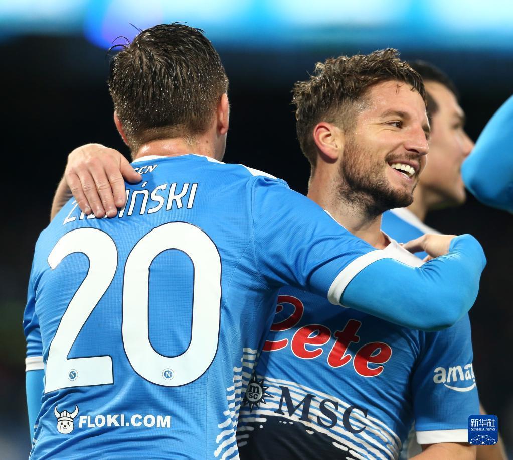11月28日,那不勒斯队球员梅尔滕斯(右)进球后与队友泽林斯基庆祝。