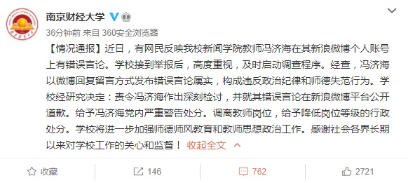 近日,有网民反映我校新闻学院教师冯济海在其新浪微博个人账号上有错误言论。学校接到举报后,高度重视,及时启动调查程序。经查,冯济海以微博回复留言方式发布错误言论属实,构成违反政治纪律和师德失范行为。