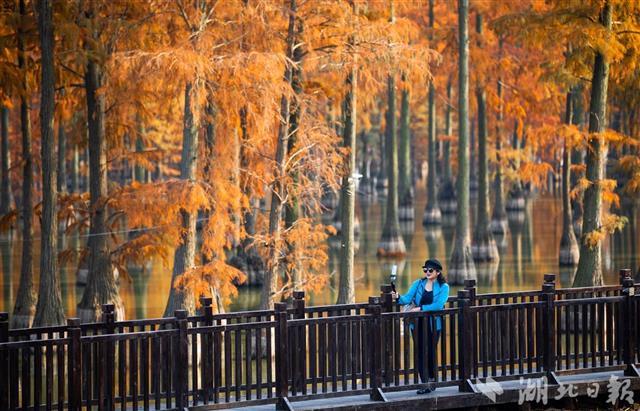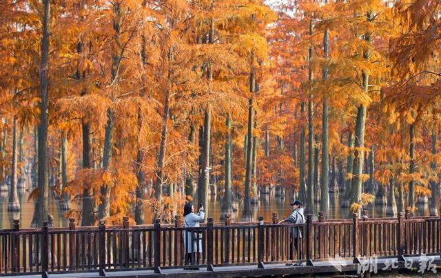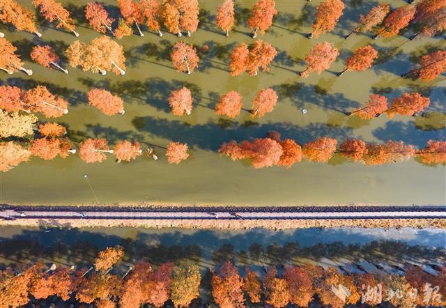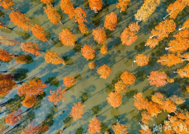 11月29日,航拍武汉市新洲区涨渡湖湿地水上森林。目前,涨渡湖水上森林进入最佳观赏期,近万株池杉树叶变红,在冬日暖阳下色彩斑斓,与清澈的湖面交相辉映,宛如童话世界。