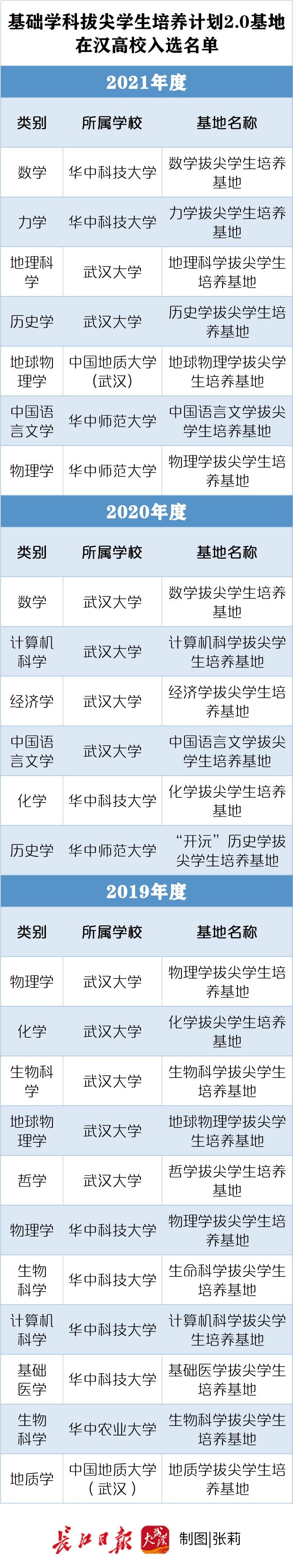 长江日报大武汉客户端讯(记者陈晓彤)11月29日,教育部发布公告,在前两批遴选建设199个基础学科拔尖学生培养基地的基础上,确定了基础学科拔尖学生培养计划2.0基地(2021年度)名单。其中,武汉大学、华中科技大学和华中师范大学各新增2个,中国地质大学(武汉)新增1个。