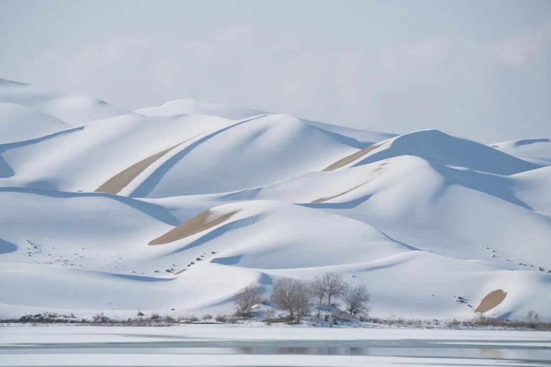 2021年11月28日,位于新疆尉犁县境内的塔克拉玛干沙漠迎来了降雪天气,连绵不绝的沙丘上犹如披上了银装,云雾在上空缠绕,沙漠、胡杨、湖泊时隐时现,宛若童话世界一般。塔克拉玛干沙漠降雪相对较为罕见,因此吸引了不少摄影爱好者前往采风。