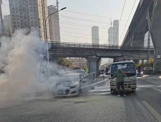 长江日报大武汉客户端11月30日讯 11月29日上午9时许,在硚口区解放大道交通银行太平洋支行门口,一辆私家车突然自燃。危急时刻,正在附近作业的一辆环卫水车快速开到现场,驾驶员用高压水枪,对着起火车辆一阵猛喷,6分钟左右大火彻底扑灭。