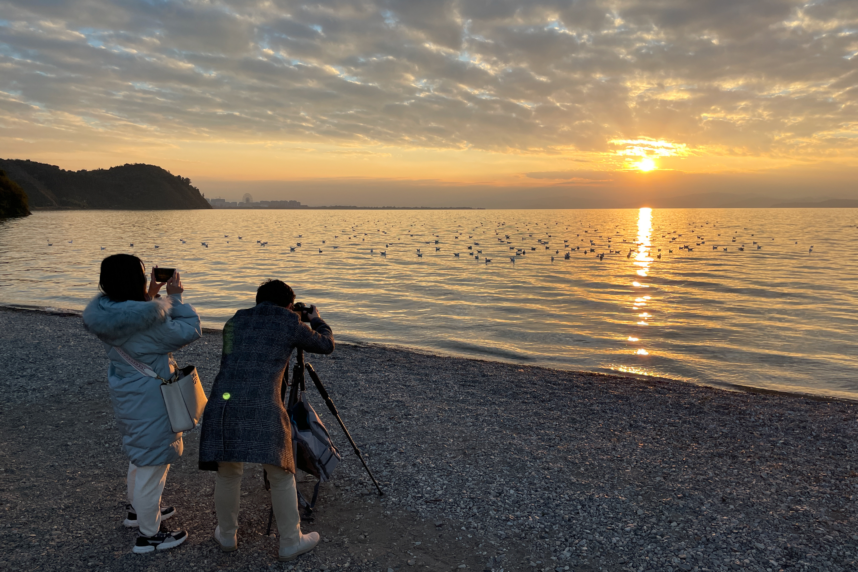 11月30日,游客在海晏村滇池畔拍摄日落。(中国日报记者 武晓慧 摄)