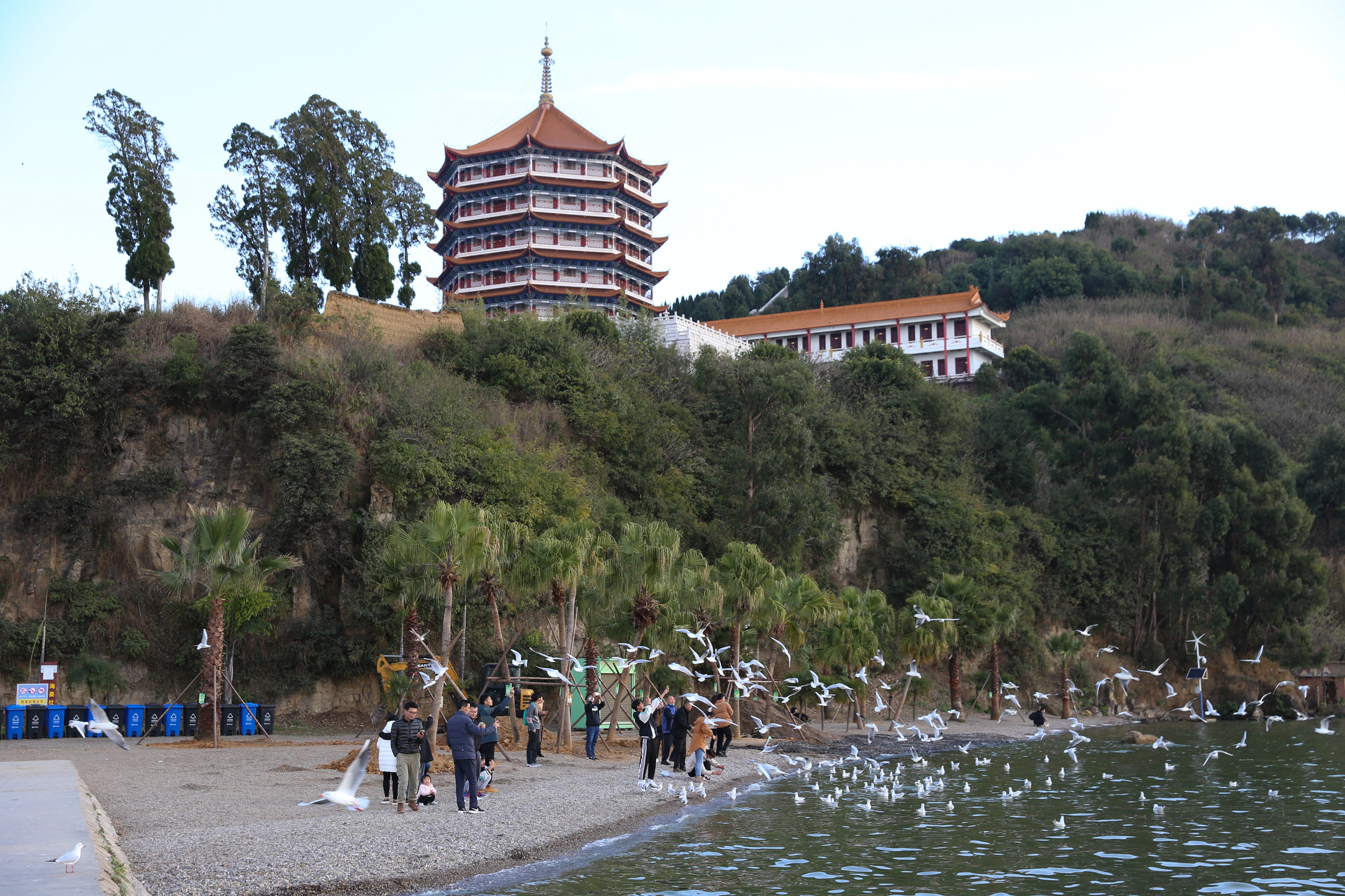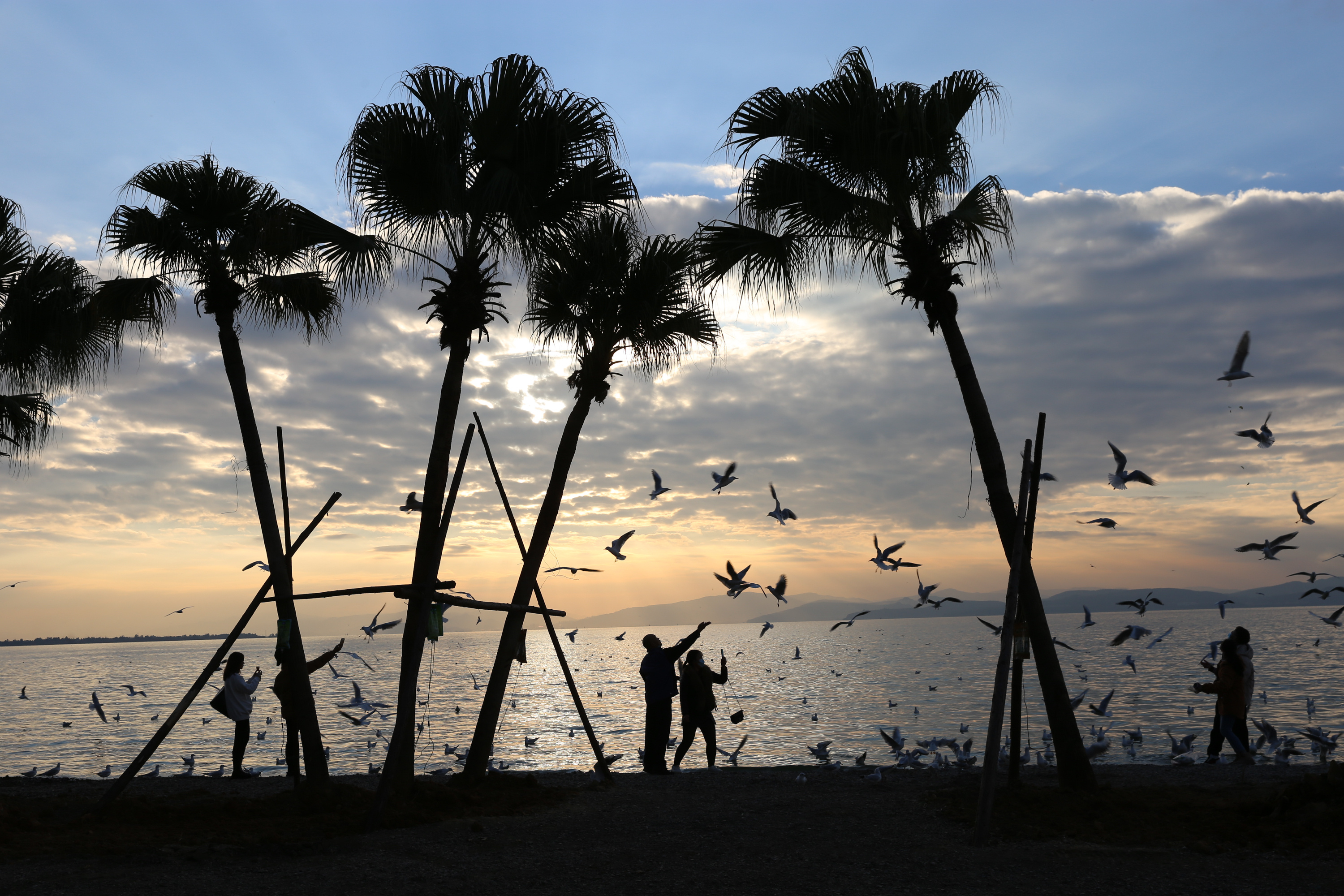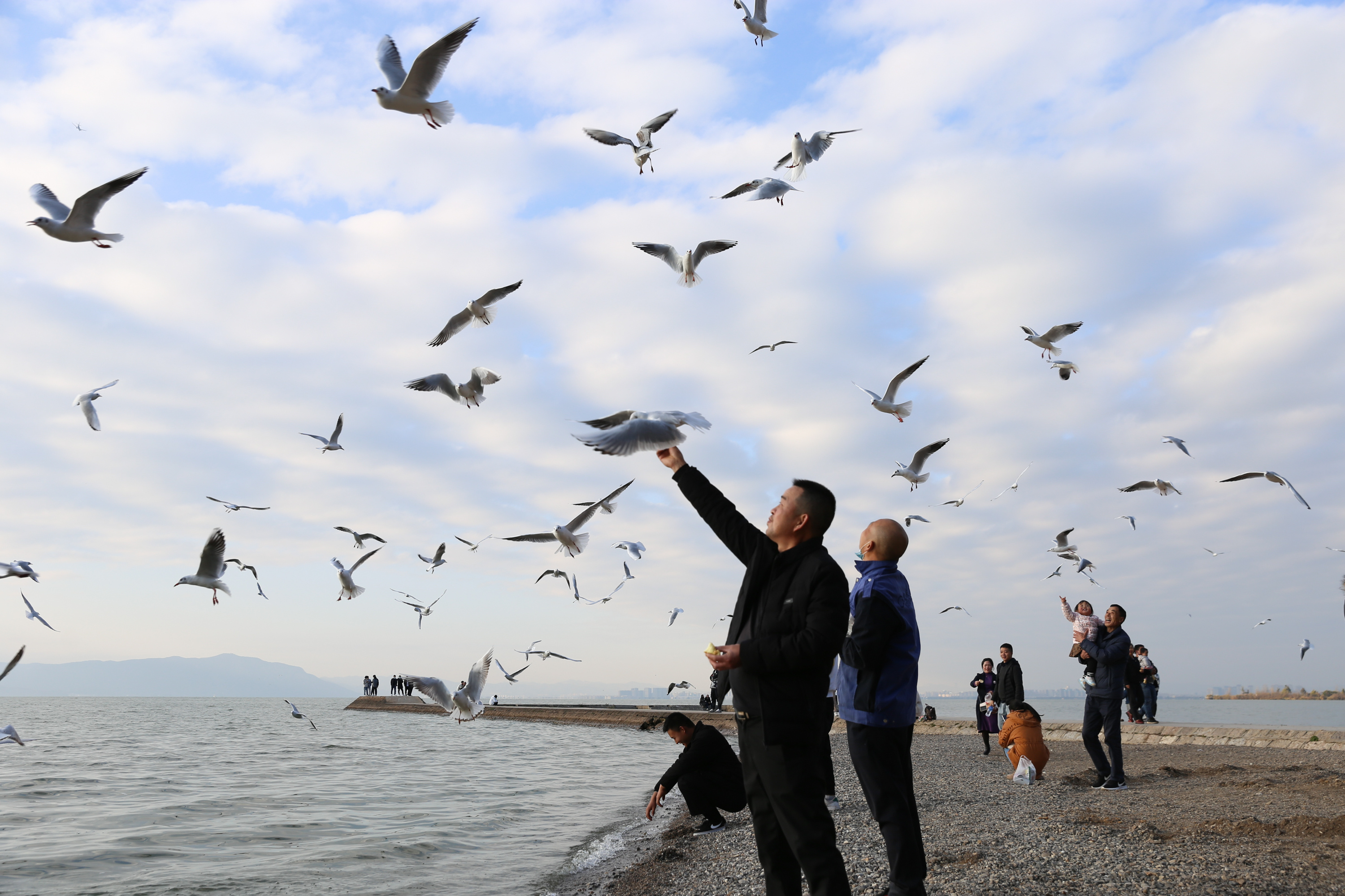 11月30日,游客在海晏村滇池畔喂食海鸥。(中国日报记者 武晓慧 摄)