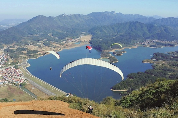 黄石大冶毛铺国际滑翔伞基地,云淡风轻,暖阳高照,五颜六色的伞花从蔚蓝的毛铺水库上空轻盈划过。