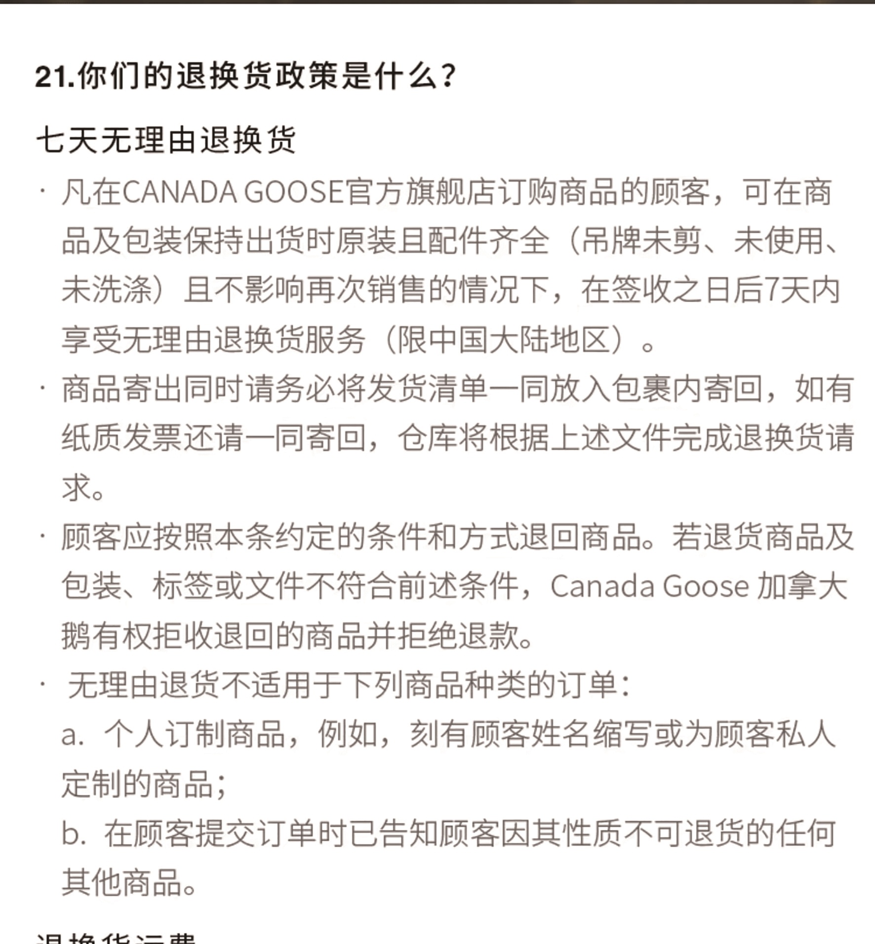 加拿大鹅天猫官方旗舰店退换货政策