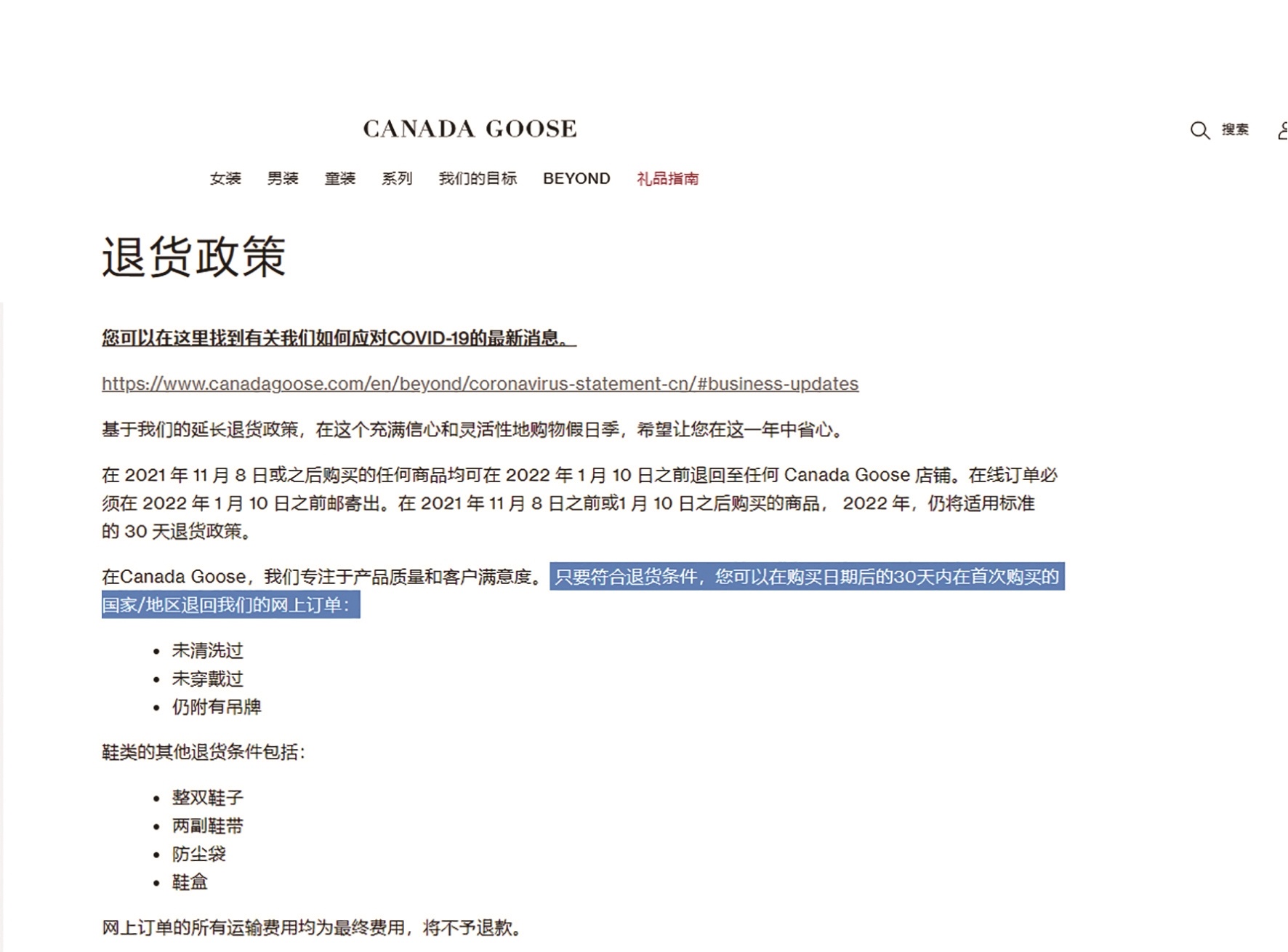 “只要符合退货条件,您可以在购买日期后的30天内在首次购买的国家/地区退回我们的网上订单。”在加拿大鹅官网的退货政策上,极目新闻记者看到,官网商品支持30日无理由退货。