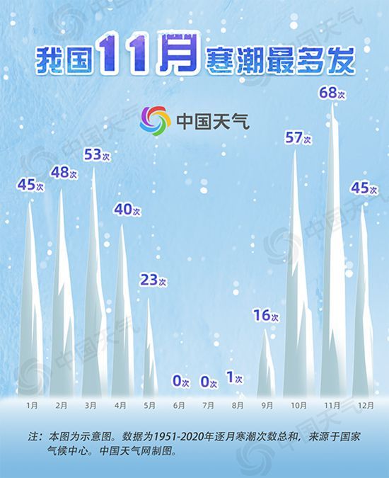 这也是11月份我国寒潮多发的主要原因。从国家气候中心1951年至2020年逐月寒潮统计数据来看,11月是寒潮发生最多的月份。