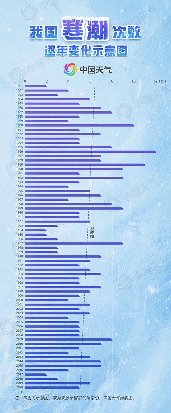 在全球变暖的大背景下,寒潮天气会越来越少吗?根据国家气候中心的统计,1951年至2020年,影响我国的寒潮次数确实总体呈减少趋势。但需要注意的是,总体趋势只是一个平均数,寒潮次数的年际变化依然是比较大的。