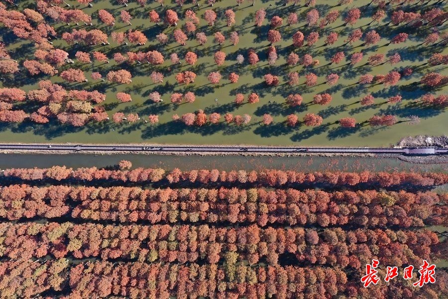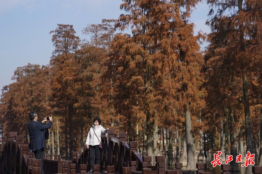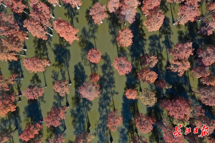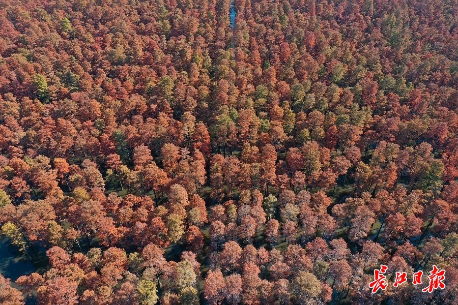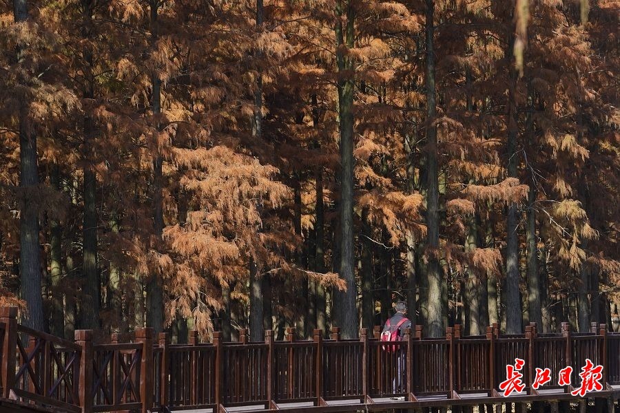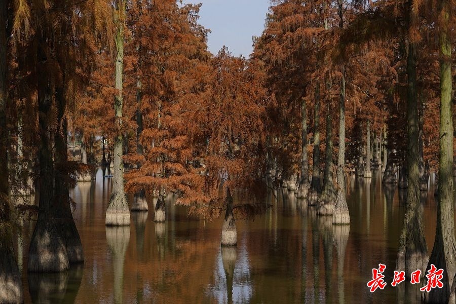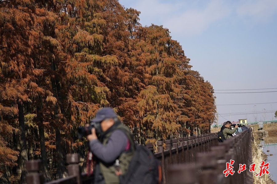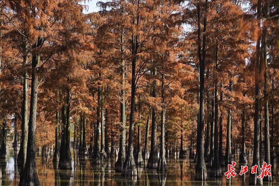 长江日报大武汉客户端12月2日讯 武汉连续多日天气晴好,距离中心城区40多公里的新洲区涨渡湖水上森林进入绝佳观景期。涨渡湖湿地数千棵池杉叶红似火,远远看去如同火焰般绚丽,吸引不少市民专程前往欣赏。(长江日报记者彭年 摄影报道)