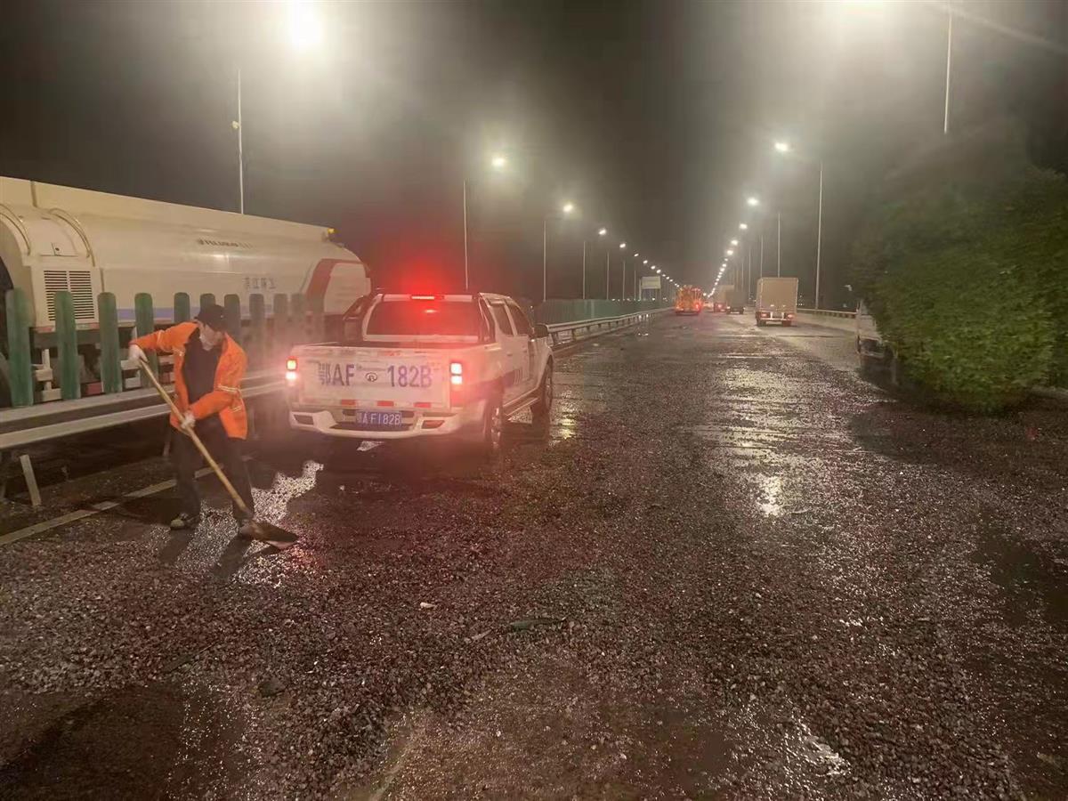 据沌口街城管所环卫队长郑世宇介绍,当天凌晨零点,在三环线武昌往汉阳方向,江城立交与汪家嘴立交之间,有两辆货车相撞,该路段大面积散落着碎石,车辆机油也漏洒出来,严重污染路面。他们在工作群接到工作调度后,安排4台水车、1台吸扫车和15名环卫工人前往事故现场。