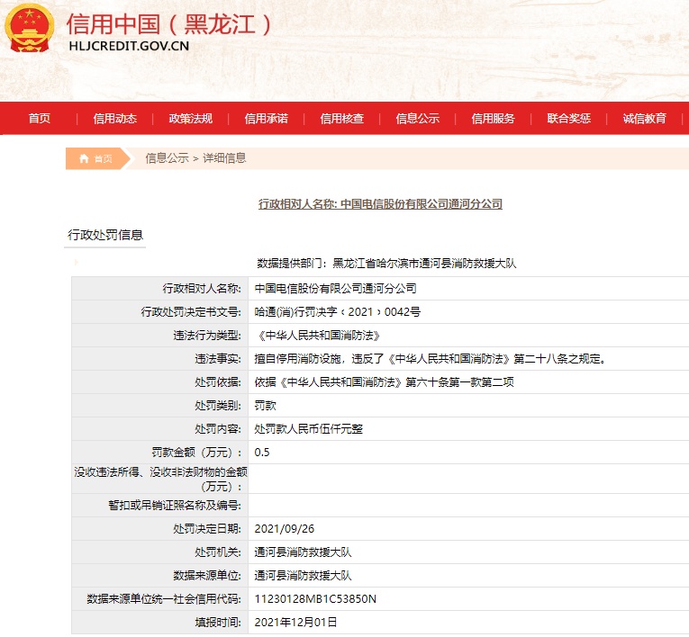 中国经济网北京12月2日讯 信用中国(黑龙江)网站日前公示的行政处罚决定书(哈通(消)行罚决字(2021)0042号)显示,中国电信股份有限公司(简称“中国电信”,601728.SH)通河分公司存在以下违法事实:擅自停用消防设施,违反了《中华人民共和国消防法》第二十八条之规定。依据《中华人民共和国消防法》第六十条第一款第二项,通河县消防救援大队对其处罚款人民币伍仟元整(5000元)。