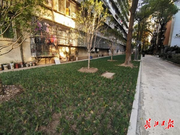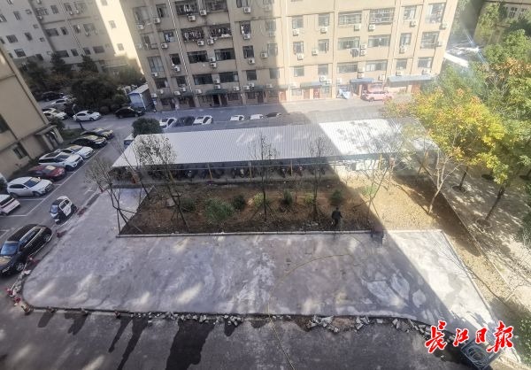 11月30日,长江日报记者在该小区看到,一块100多平方米的水泥地面刚完成硬化,能停放10余辆汽车,一侧还遗留有一处绿地,新栽种了灌木和乔木。