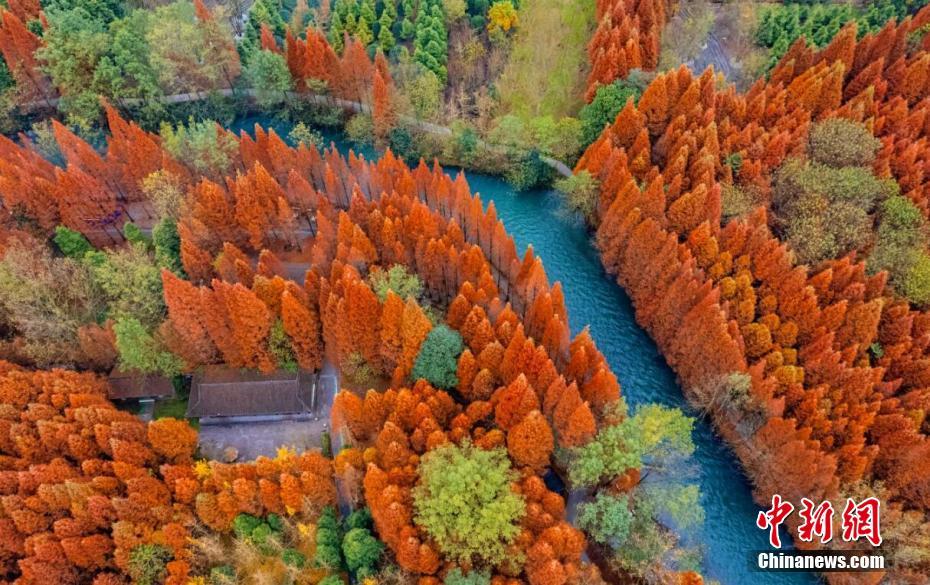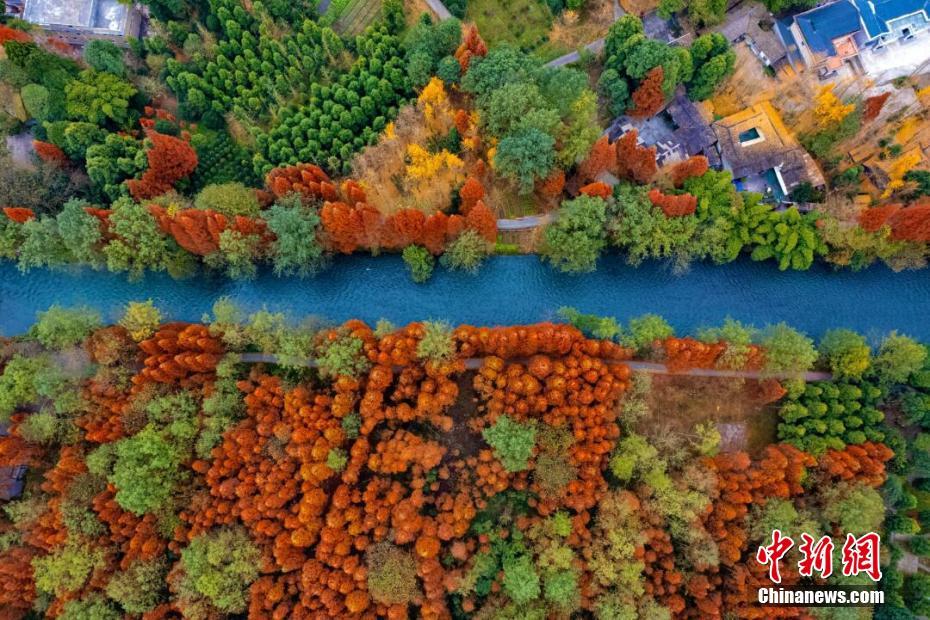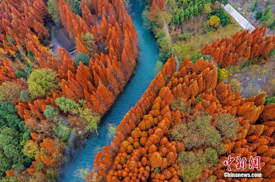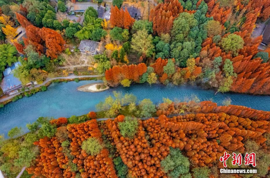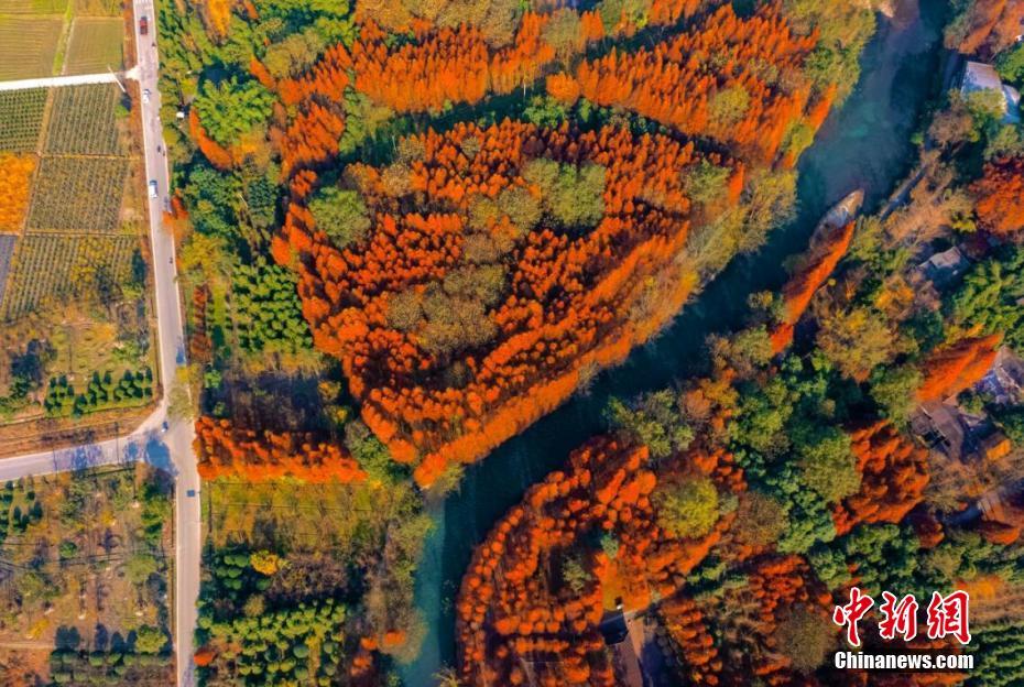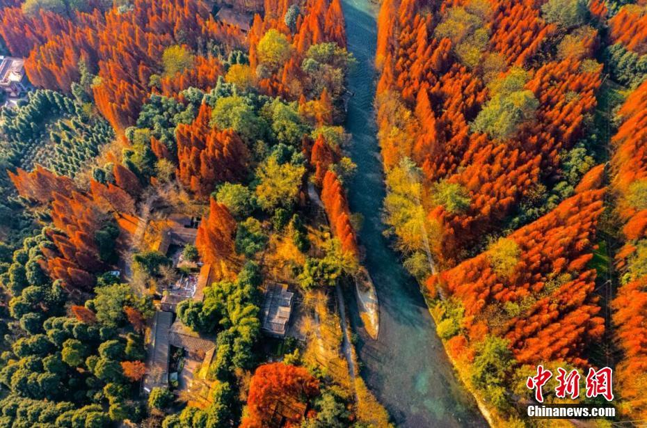 初冬时节,四川都江堰朱家湾换上绚烂多彩的“衣装”,林盘里的水杉随着气温降低,细密如针的叶子逐渐变为橙红色,在阳光的照耀下,色彩斑斓,构成了一幅美妙的乡村色彩画卷 。朱家湾林盘位于都江堰石羊镇马祖社区,总面积约500亩,由朱家院子、黄家院子等6个大小不一的院落组成,属于典型的“田、林、水、院”格局,是一个独具特色的川西林盘。都江堰市委宣传部供图