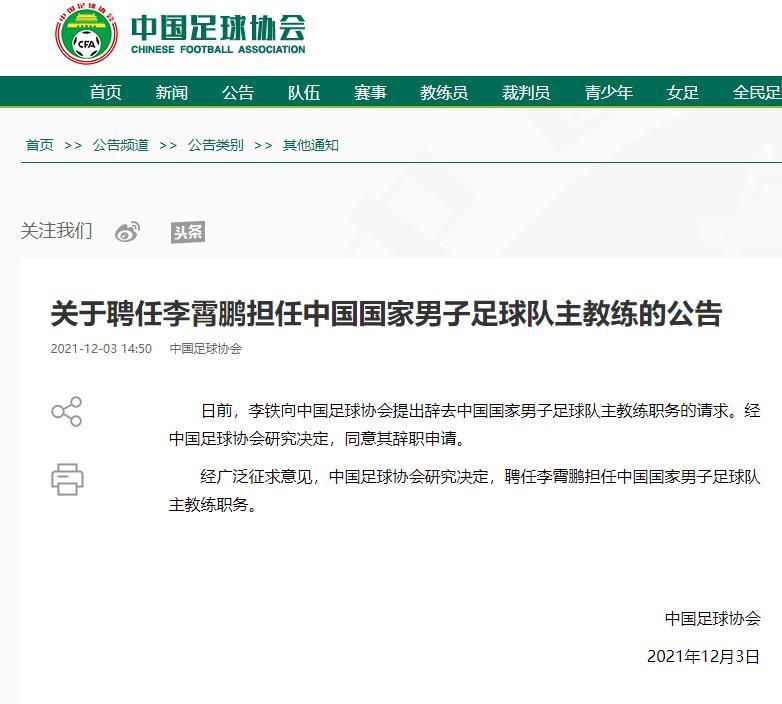 经广泛征求意见,中国足球协会研究决定,聘任李霄鹏担任中国国家男子足球队主教练职务。