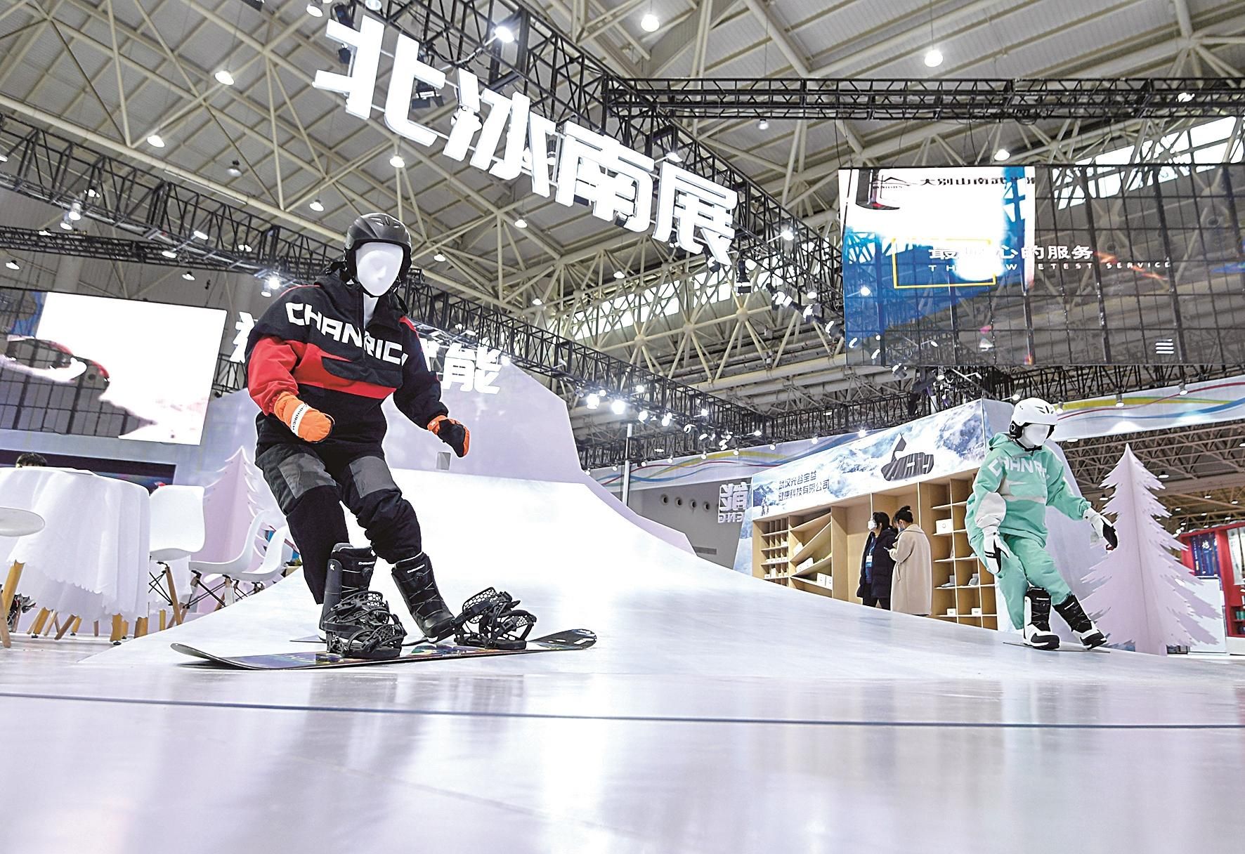 在体育消费展区,记者看到,几名专业运动员在百余平方米的“高山雪场”上“滑雪”,动作一气呵成,速度之快,引来围观群众连连惊叫。