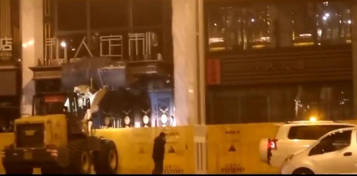 哈尔滨当地居民赵先生告诉极目新闻记者,12月3日晚上,他开车路过南岗区嵩山路59号私人定制KTV时,发现KTV门口用黄色的挡板挡着,有一台挖机停在门口,有工人站在挖机的挖斗内拆除“私人定制”四个字。