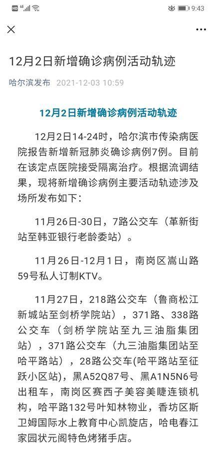 根据哈尔滨市疫情指挥部最开始发布的信息,12月2日0-11时,哈尔滨市报告新增本土新冠肺炎确诊病例3例,均为满洲里市确诊病例在哈的密切接触者。