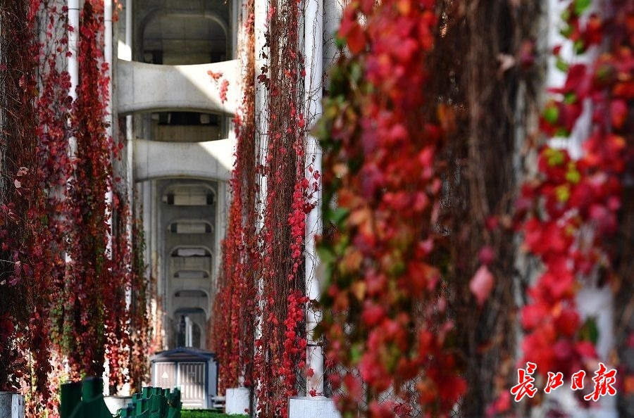 12月4日,硚口宜秀路长丰高架百余个桥墩上绕满了通红的爬山虎,成为一道独特的风景。长江日报记者李永刚 摄
