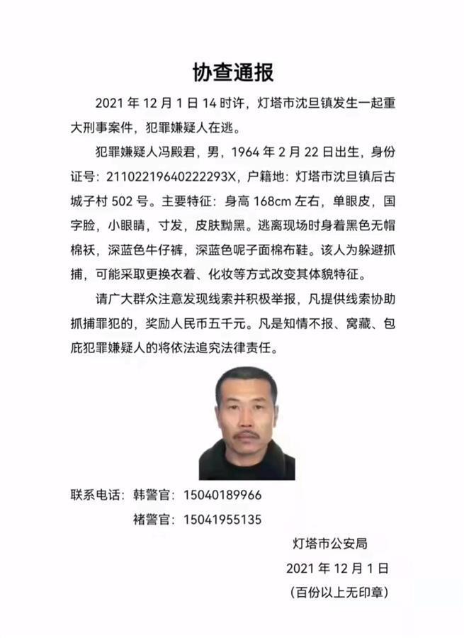 12月1日,辽宁省辽阳市灯塔市公安局发布的协查通报称,12月1日下午2时许,灯塔市沈旦镇发生一起重大刑事案件,犯罪嫌疑人在逃。犯罪嫌疑人冯殿君,男,1964年2月22日出生,逃离现场时身着黑色无帽棉袄,深蓝色牛仔裤,深蓝色呢子面棉布鞋。该人为躲避抓捕,可能采取更换衣着、化妆等方式改变其体貌特征。请广大群众注意发现线索并积极举报,凡提供线索协助抓捕罪犯的,奖励人民币五千元。