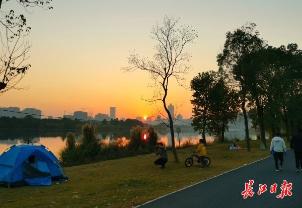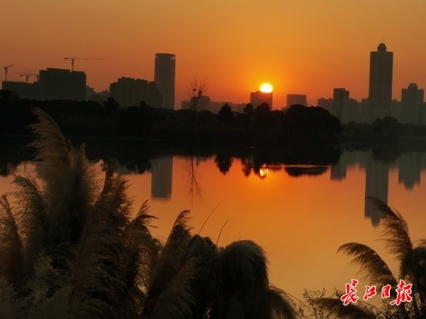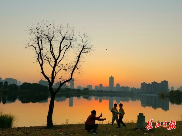 长江日报大武汉客户端12月5日讯 5日傍晚,一轮红日映照在金银湖湖面上,市民用手机记录这一难得景象。