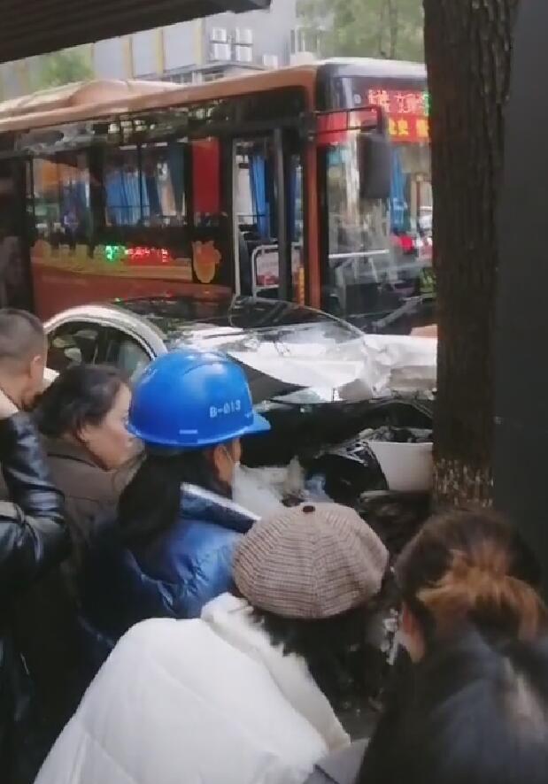 网传多段视频显示,一辆白色轿车车头撞在一棵树上,损毁严重,轿车前方有两人躺倒在地,地上有血迹,轿车旁还停放有一辆公交车,公交站站牌写着“市一中”,附近已经拉起了警戒线。
