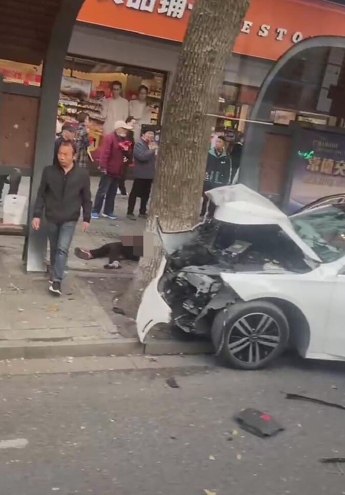 王女士(化姓)告诉记者,下午她曾路过该公交站,看到一辆白色轿车车头撞在一棵树上,轿车附近还有两人受伤倒地。