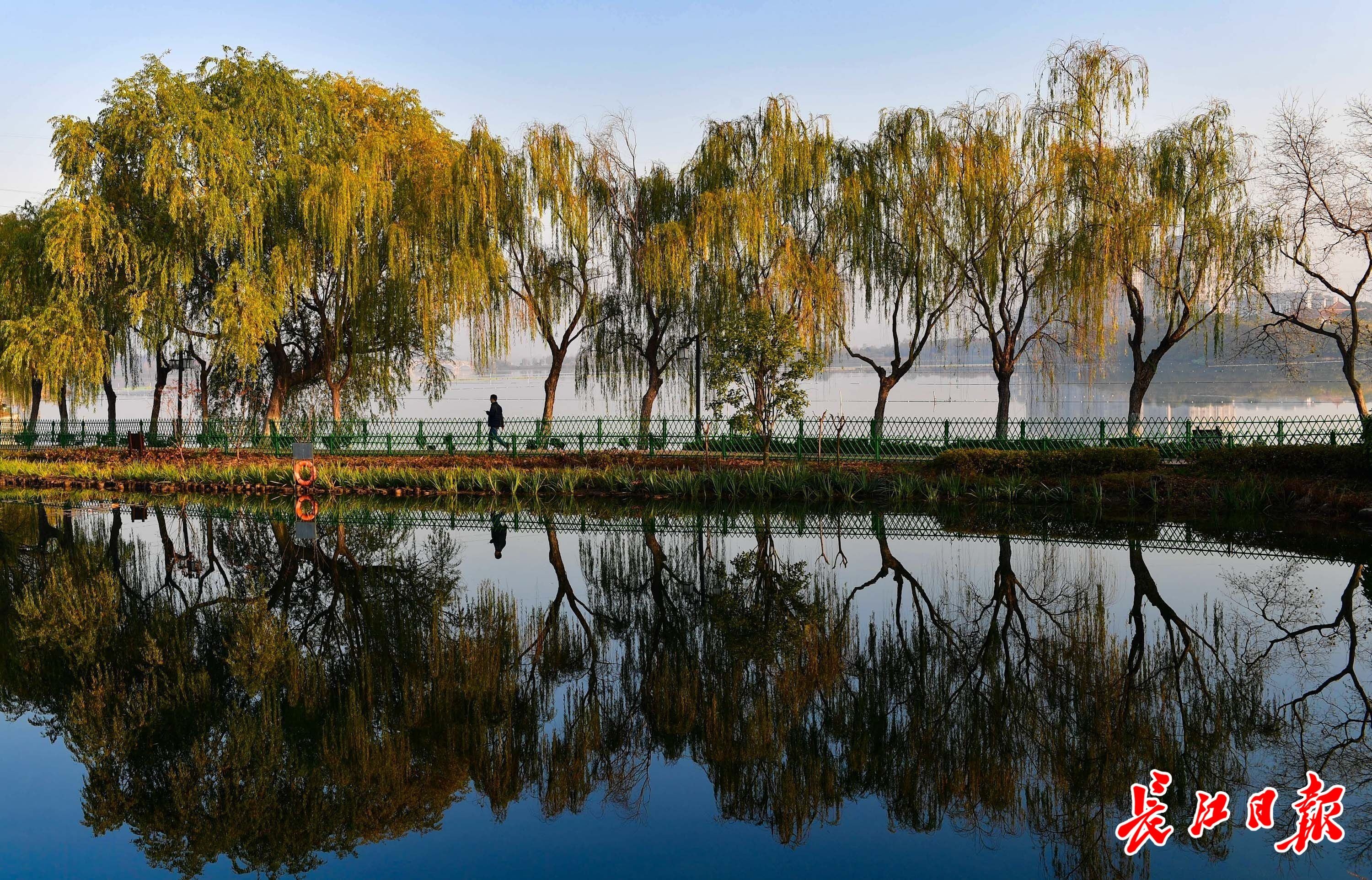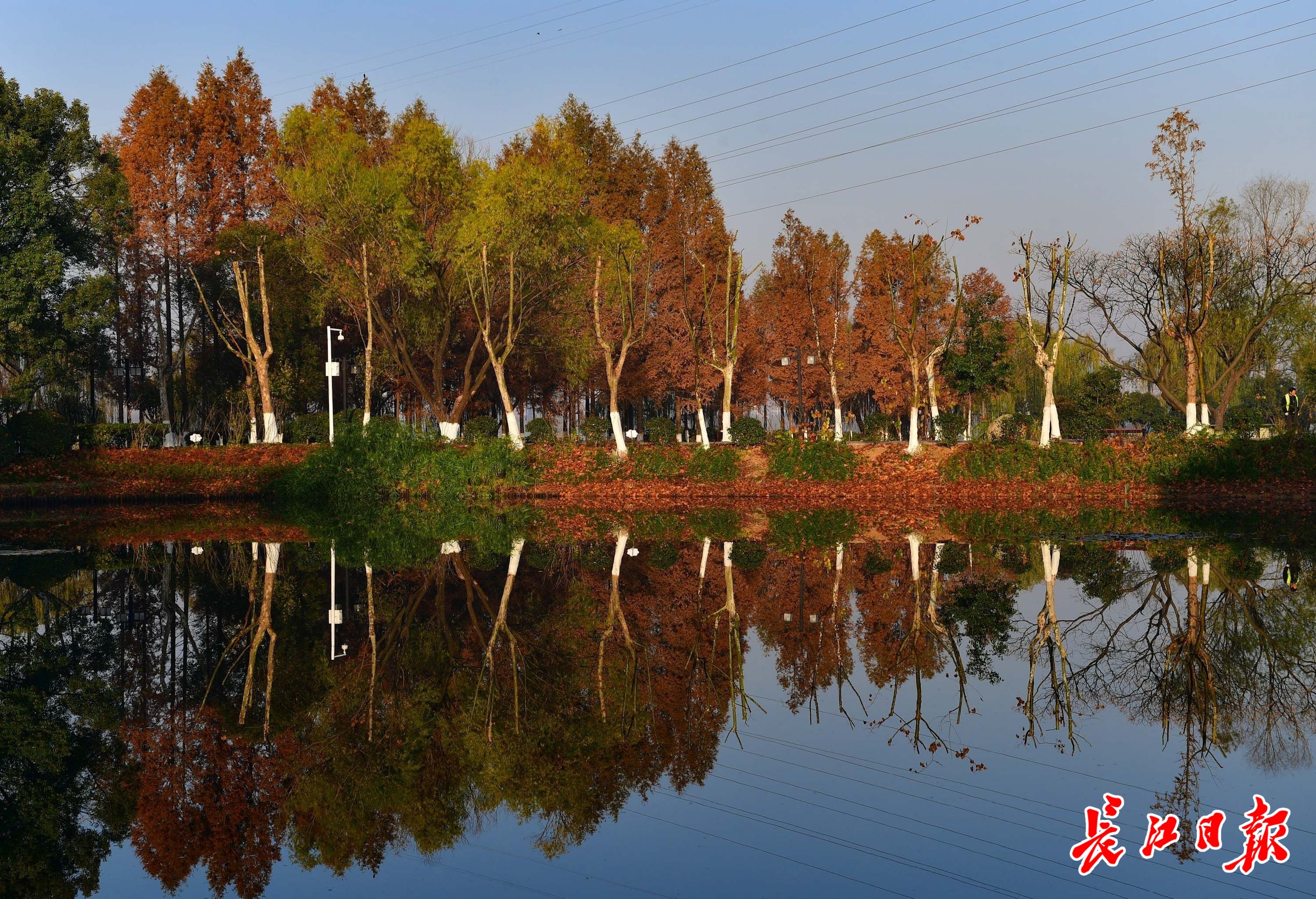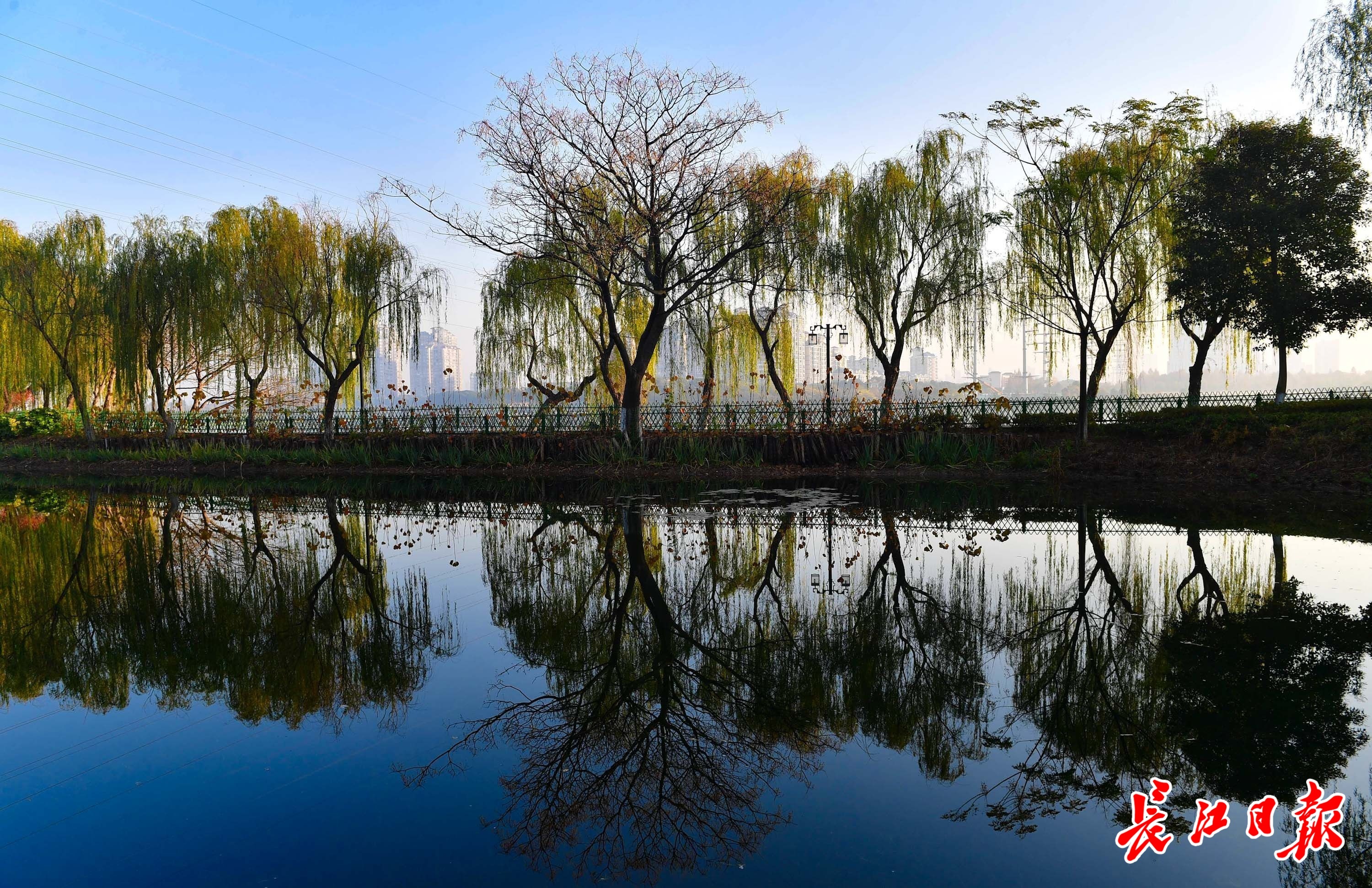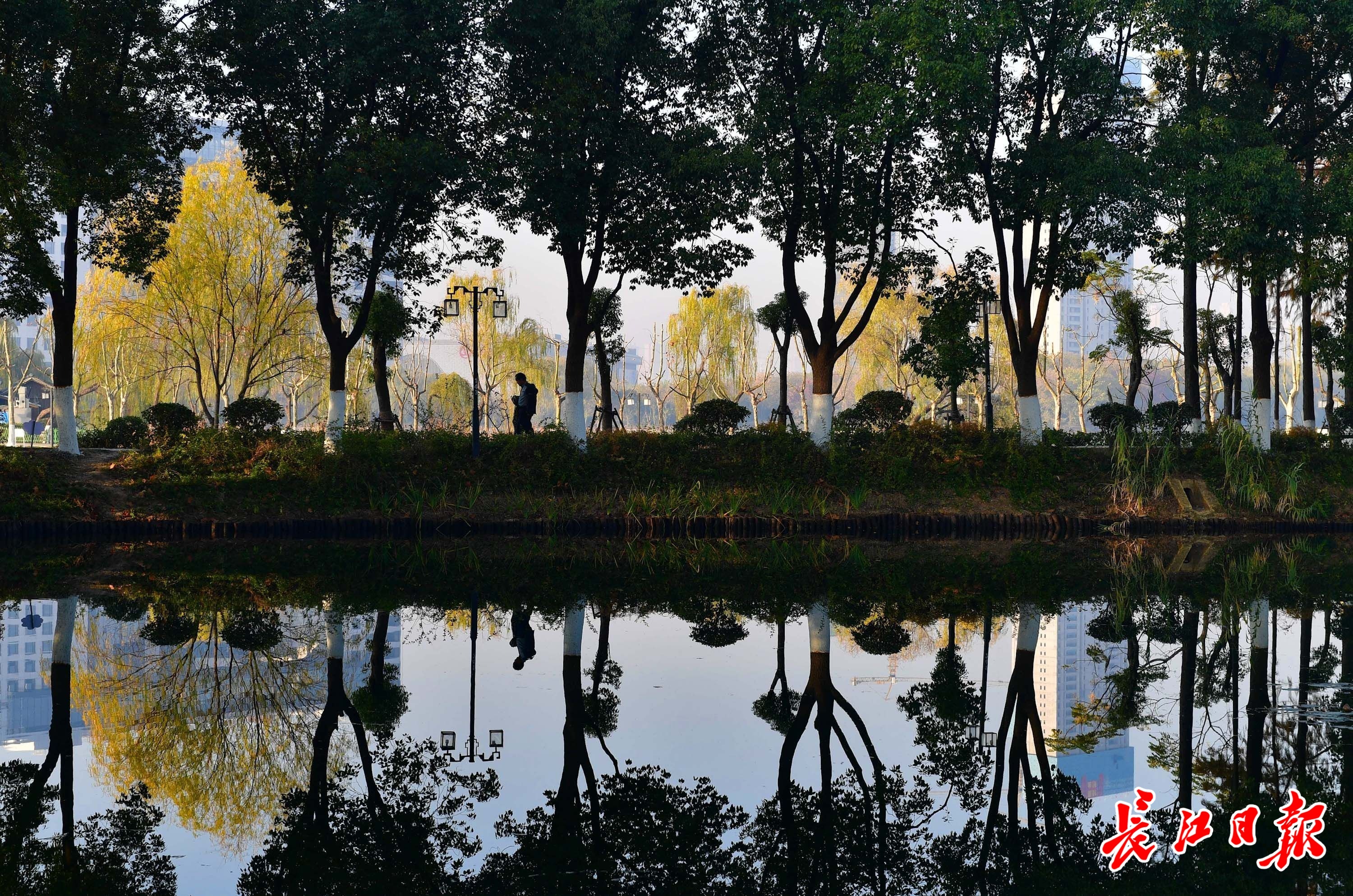 12月6日晨,武汉天气晴朗。金银湖湿地公园里,湖面平静如镜,倒映出蓝天和岸边的各色树木、建筑,一上一下、一正一反,犹如科幻小说中的平行宇宙。