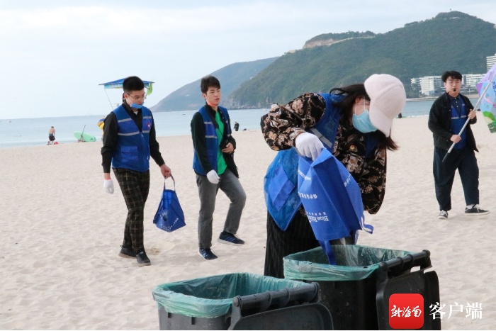 志愿者们来到海滩上,寻找被游客遗弃的垃圾。并在净滩结束时,将垃圾分类倒入海边的垃圾桶内。