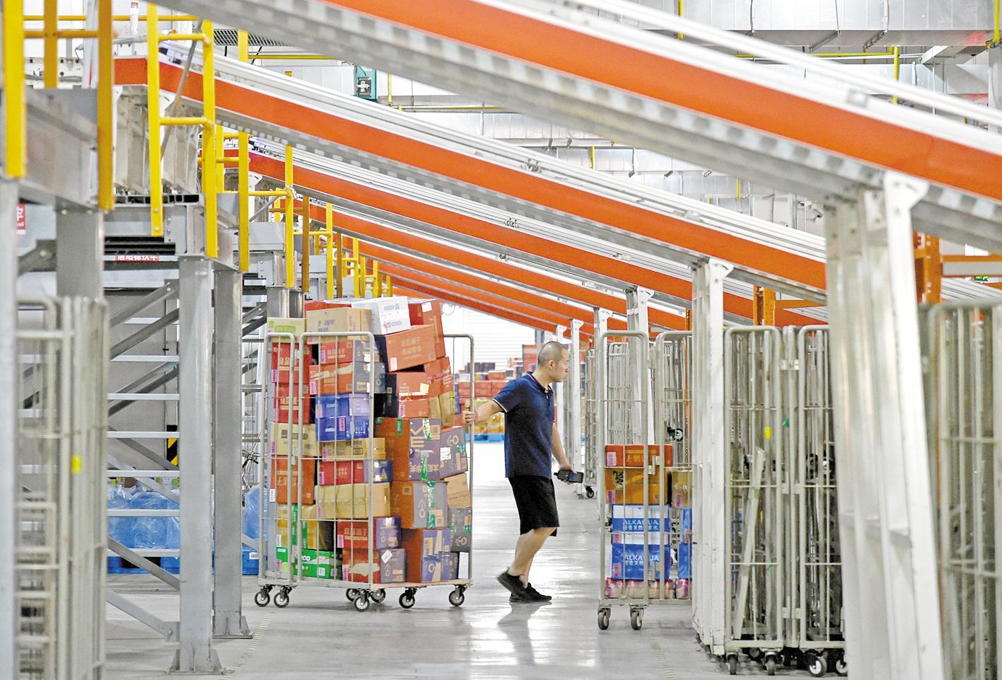 在良品铺子华中智能仓储中心,工作人员将分拣完毕的货品装车。